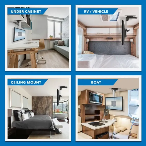 This under cabinet TV mount makes a great space saver and organizer for your home or work place. The flip up mount keeps your screen out of sight until you want it. Fit it under a cabinet or on your ceiling to make viewing your display more comfortable and more convenient. The swiveling feature and adjustable height allows you to find the perfect TV position for a better viewing experience.