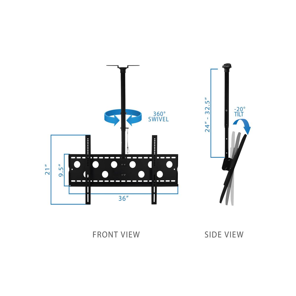 The MI-501L ceiling mount allows you to create ergonomic and comfortable positions with ease. Tilt your screen to reduce glare and set the perfect angle. The height-adjustability feature allows you to set it at the ideal viewing position. Pan your screen over 360 degrees to make corner installations or room layout alterations a breeze. Integrated cable management helps keep your cords tidy yet easily accessible.All necessary hardware and instructions included.