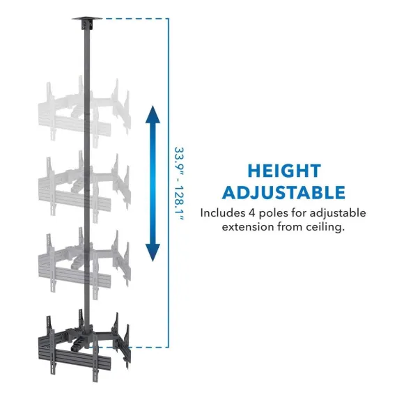 Use this mount to place information or entertainment where it can easily be seen, regardless of wall space. Make content viewable from any point in your facility with this 360 digital signage display mount. Three telescoping mounting arms can hold three screens evenly spaced in a square or rectangular configuration, helping you create the ideal multi-display ceiling mounted solution. Displays can be mounted in landscape or portrait orientation.Each arms adjustable depth allows the installer to set the spacing between each display to meet your applications needs. With clutter-free cable management, 360 of swivel, and 15 degrees of downward tilt, this mount creates the perfect viewing angle for any application. Four modular pole pieces allow height adjustment between 33.9 inches to 128.1 inches from the ceiling.