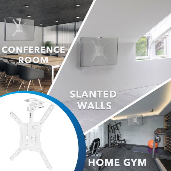 You have a slanted wall and need to mount your TV or you like your TV neatly stowed away when not in use? Then this flip down ceiling TV mount is the right solution for you! It fits television screens between 23 and 55 inches and up to 44lbs. When your TV is not in use, you can fold it away and lock it securely in place. To achieve the perfect viewing angle, this TV mount allows you to swivel your screen +/- 45 degrees. The extendable VESA plate fits all standards between 75 x 75 and 400 x 400 mm and can be easily removed from the pole. This compact ceiling mount is suitable for a variety of environments including living room, bedroom, office, school or gym.