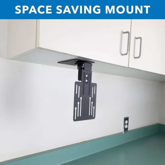 This under cabinet TV mount makes a great space saver and organizer for your home or work place. The flip up mount keeps your screen out of sight until you want it. Fit it under a cabinet or on your ceiling to make viewing your display more comfortable and more convenient. The swiveling feature makes finding the perfect position even easier.