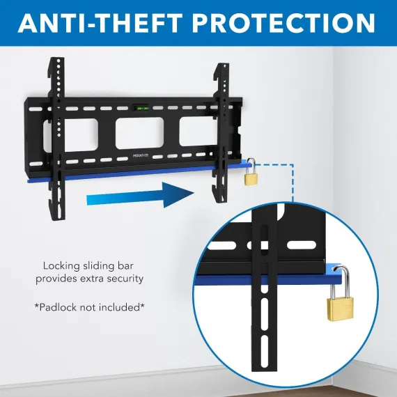 Our heavy-duty TV wall mount is meticulously engineered to elevate your viewing experience with unrivaled strength and versatility. The mount's new and improved design now holds medium to large TVs up to 80" and 175 lbs and its robust construction ensures your precious screen remains securely in place. With an ultra-low profile of just 0.9", this mount seamlessly integrates into any space, offering a sleek look with your TV sitting almost flush on the wall. Safety is paramount, especially in public settings, which is why our mount features an anti-theft design, requiring a padlock for added security and peace of mind. Versatility meets compatibility with VESA patterns ranging from 100x100 to 600x400, ensuring a perfect fit for a wide array of TVs. Say goodbye to cable clutter with large openings in the wall plate, enabling effortless cable routing to keep your setup clean and organized. Whether installing on wood studs or solid walls, our mount offers versatile installation options, providing the flexibility you need to achieve the perfect viewing angle in any room.