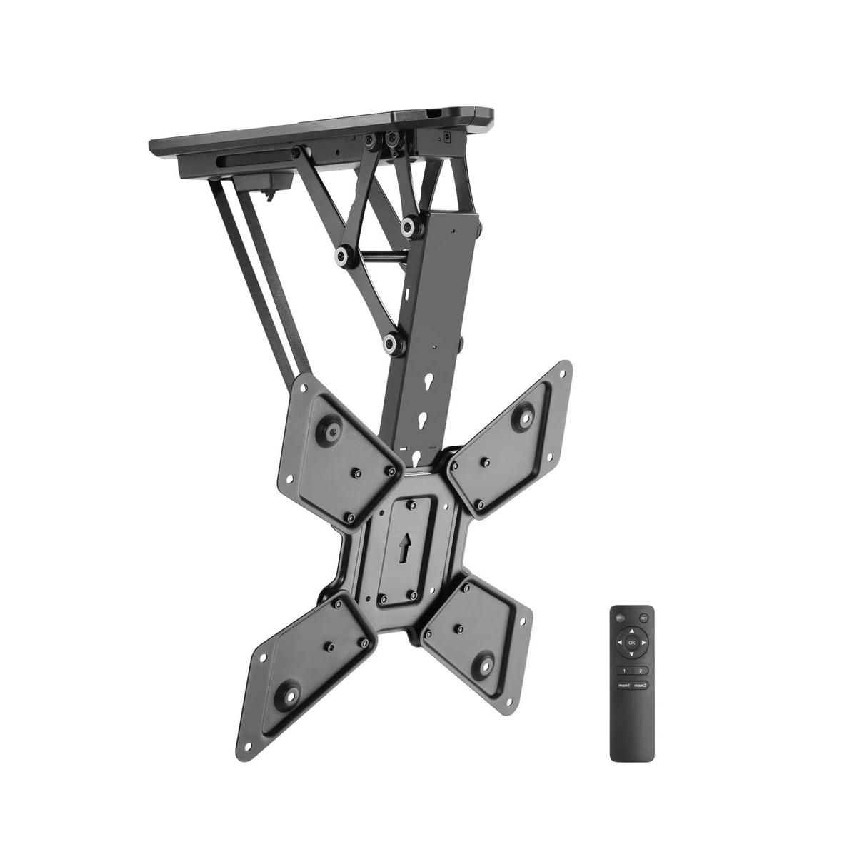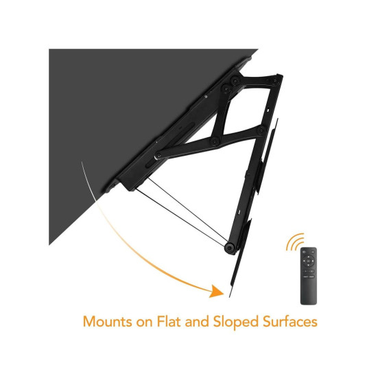 This full-motion motorized TV mount keeps the TV tucked away and out of sight when not in use. Fold it down when it's time to watch with the use of the included remote control. This mount features a 0 to 75-degree tilt and works great on both a flat and pitched ceiling, providing more versatility to adapt to more spaces. A manual height adjustment of the ceiling mount can be made to ensure a comfortable viewing angle of your TV screen. It can hold up to 66lbs and fits most TV brands from 23" to 55".This flat screen TV ceiling mount comes with an instruction manual for easy installation. The powerful electric motor is surrounded by strength tested steel, making this one of our most durable TV accessories. Get your Mount-It! motorized TV wall mount today!