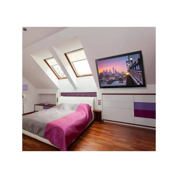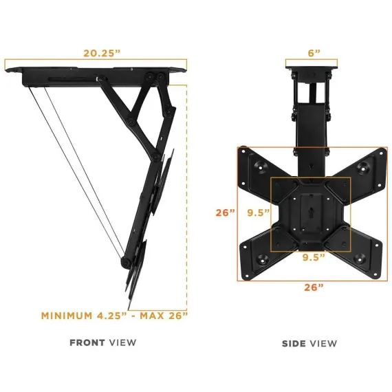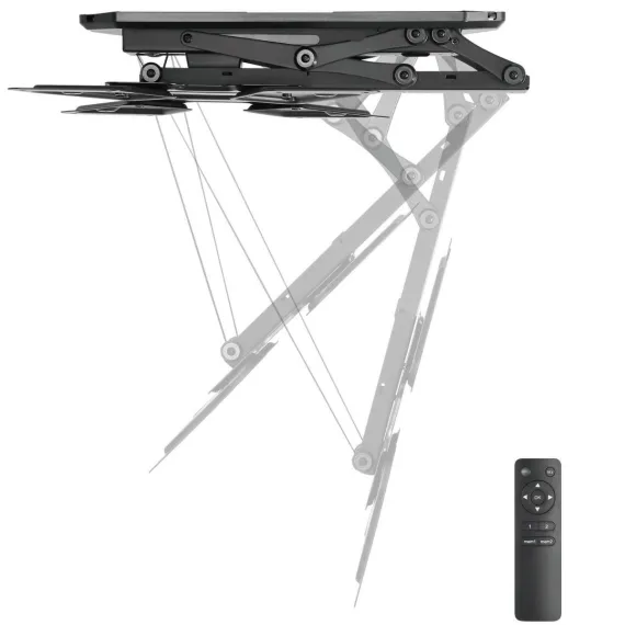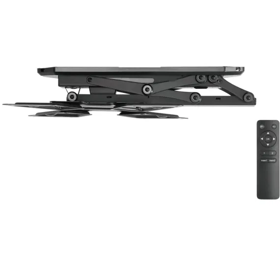This full-motion motorized TV mount keeps the TV tucked away and out of sight when not in use. Fold it down when it's time to watch with the use of the included remote control. This mount features a 0 to 75-degree tilt and works great on both a flat and pitched ceiling, providing more versatility to adapt to more spaces. A manual height adjustment of the ceiling mount can be made to ensure a comfortable viewing angle of your TV screen. It can hold up to 66lbs and fits most TV brands from 23" to 55".This flat screen TV ceiling mount comes with an instruction manual for easy installation. The powerful electric motor is surrounded by strength tested steel, making this one of our most durable TV accessories. Get your Mount-It! motorized TV wall mount today!