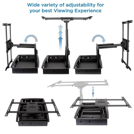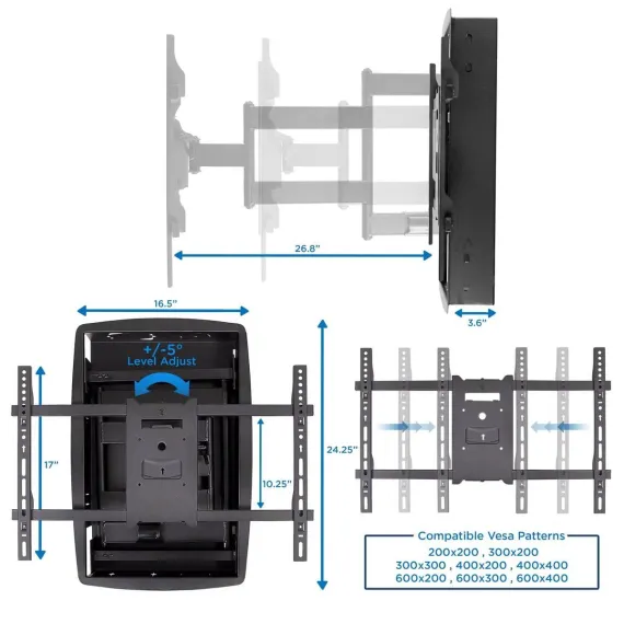 A TV wall mount with both full motion capabilities and an ultra low-profile design. The recessed wall mount fits between standard 16" studs and safely and securely mounts to the inside of the studs. It can safely extend up to 26.8" for a perfect view from anywhere in the room. Utilize the tilt and swivel functionalities to create the ultimate viewing experience.