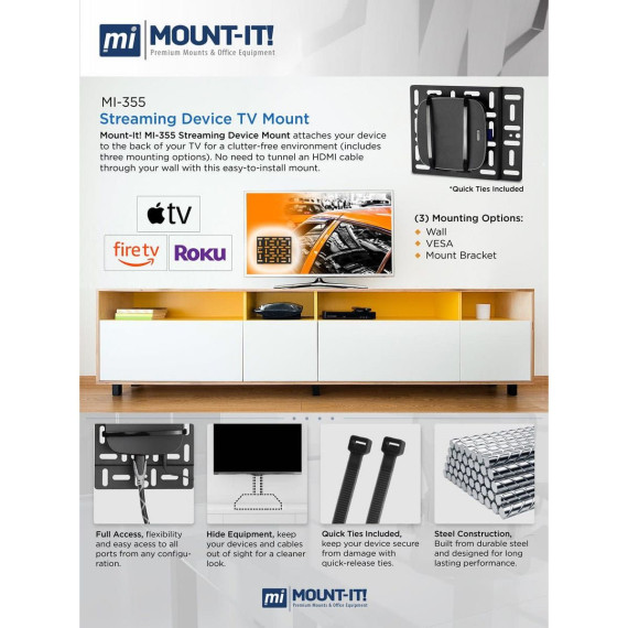 The MI-355 will fit most streaming devices on the market including Apple TV, Amazon Fire TV, Roku, TiVo, and other players. Hide your devices behind your TV for a clean look without any clutter. Clear up cable clutter by keeping your device mounted behind your TV so they are not loose on your TV stand. This versatile mount allows you to mount your streaming media player behind a TV or to a wall, while maintaining full access to your devices. High-strength steel and cable ties ensure your media device is securely connected to the mount. It can also be used to mount your cable router, modem, or gaming consoles to a wall.