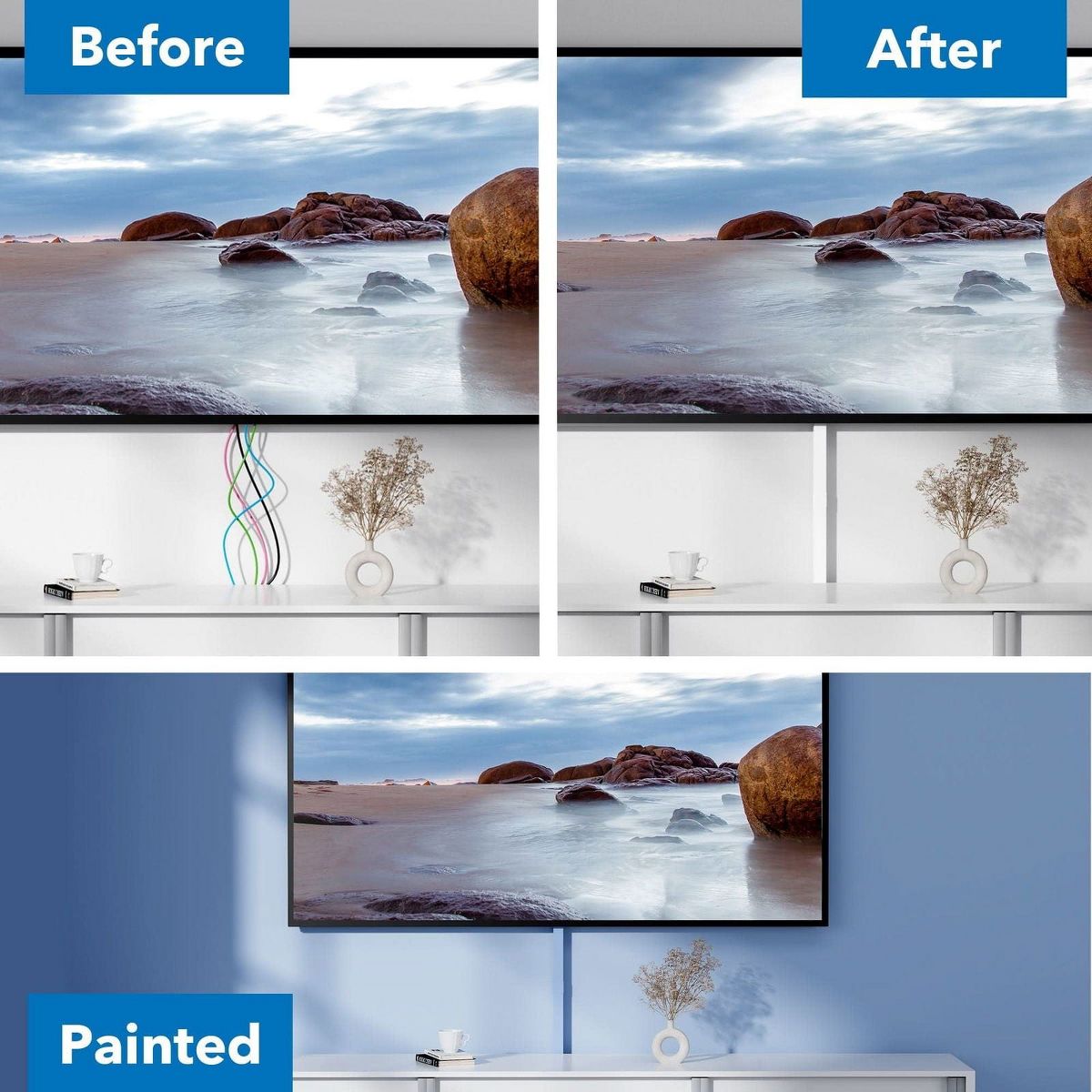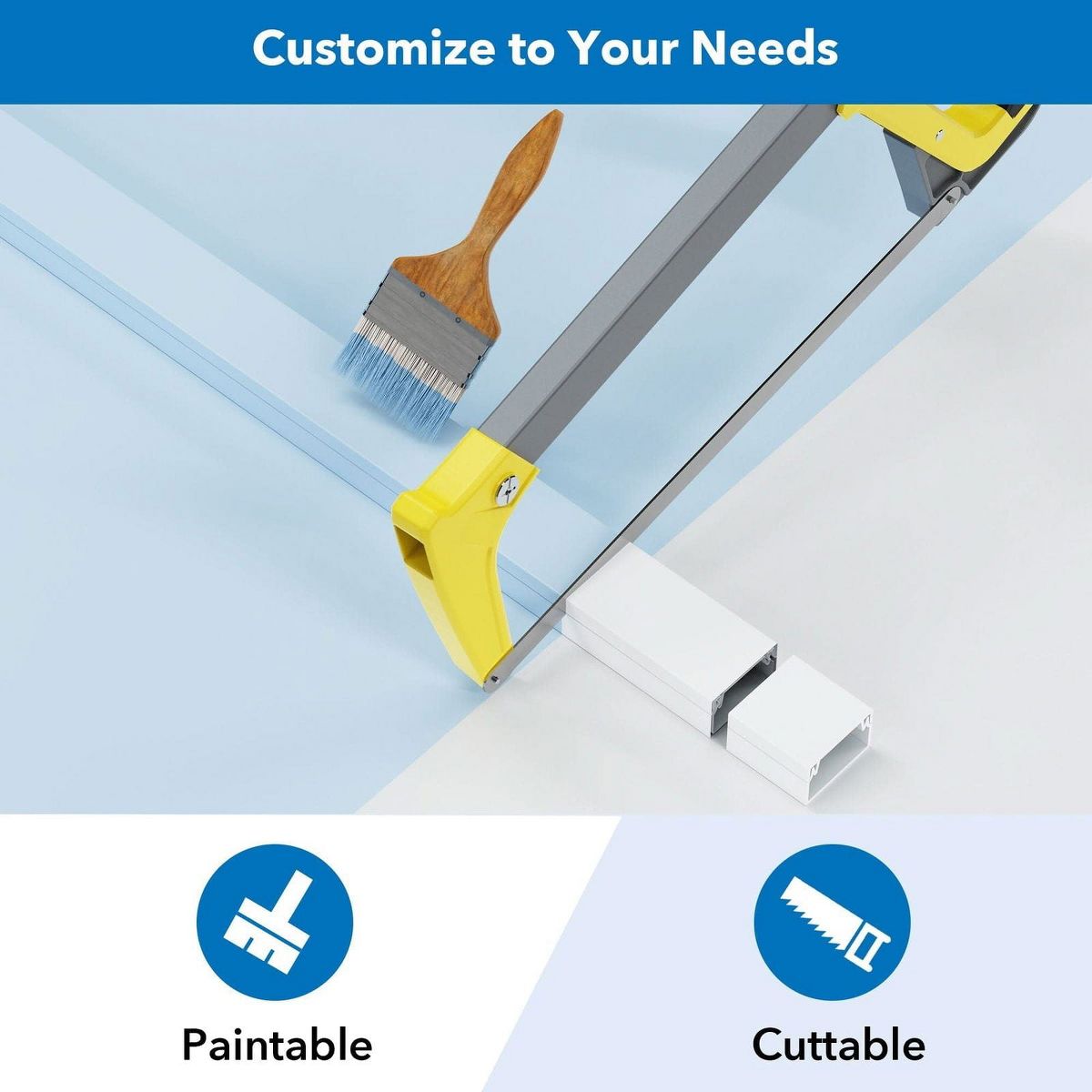 Tired of unsightly cords and cables ruining the sleek look of your wall-mounted TV? Say goodbye to the clutter with our On-Wall TV Cable Concealer Kit. It allows you to easily conceal and organize your cables, transforming the visual appeal of your entertainment space. No more distractions or eyesores just a clean, seamless finish that complements your dcor. Designed for versatility, our cable concealer kit is not limited to hiding cables underneath your TV. You can effortlessly route them along door frames and baseboards, maintaining a tidy appearance throughout your living space. The kit comes with 10 cable raceways (each measuring 15.7 inches) and a variety of connectors, providing ample coverage for a sleek and discreet cable management solution. Customization is key, and our raceways can be cut to the desired size to ensure a perfect fit for your unique setup. They are also paintable, allowing you to match them seamlessly with your existing dcor. The comprehensive kit includes everything you need for a hassle-free installation. Made of high-quality, fire retardant PVC (Certified to meet the requirements of UL-94, V-0).