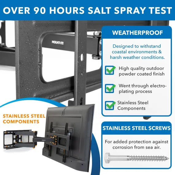 This weatherproof TV mount is specially designed for your outdoor movie night, watching your favorite sport or TV show in the comfort of your own back yard. Powder-coating, electroplating, and stainless-steel hardware ensure your new TV mount will withstand harsh weather conditions, is resistant to rain, corrosion and humidity. The full motion mount will hold TVs between 37 and 80 inches in screen size and securely supports a maximum weight of 110 lbs. To help you find your perfect viewing angle, the mount can swivel 120, offers a +10/-20 tilt and can be extended up to 20" from the wall.