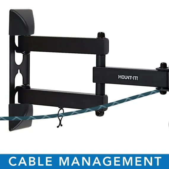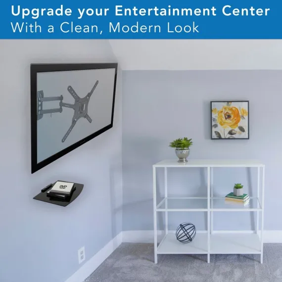 The MI-894 full motion TV wall mount is compatible with screens from 23" - 55". The tilt and swivel features will help you find the perfect viewing angle. Reduce glare and eye strain by tilting the screen. The included shelf conveniently holds your AV components within easy reach of your TV for an easier connection. This full motion TV mount allows for maximum viewing flexibility. Upgrade your entertainment center with this TV wall mount with shelf for a clean, sleek and minimalist look.