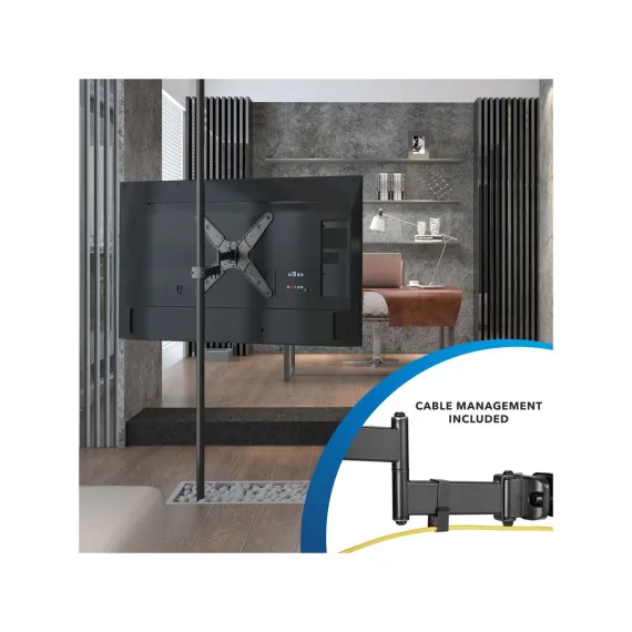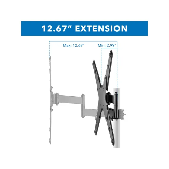 This TV Pole Mount with extendable full motion arm is a versatile solution for those who want to mount their TVs without the need for walls or surfaces. Installed on a 1.1" - 1.96" diameter pole (not included), this TV mount can securely hold large displays between 32" and 55", including curved screens weighing up to 55lbs. You can rotate your TV up to 360 deg. around the pole, swivel up to 90 deg. left and right and adjust the tilt 10 deg. up or 15 deg. down to find the perfect viewing angle and reduce glare. Horizontal fine alignment after installation is possible with the +/-3 deg. leveling function. The easy and firm clamp installation makes this mount ideal for use in retail environments, at trade shows and events as well as hotels and restaurants. Additionally, this full motion pole mount is made from sturdy steel and aluminum and offers extensive VESA compatibility between 75 x 75 and 400 x 400, ensuring that it can fit a wide range of displays.