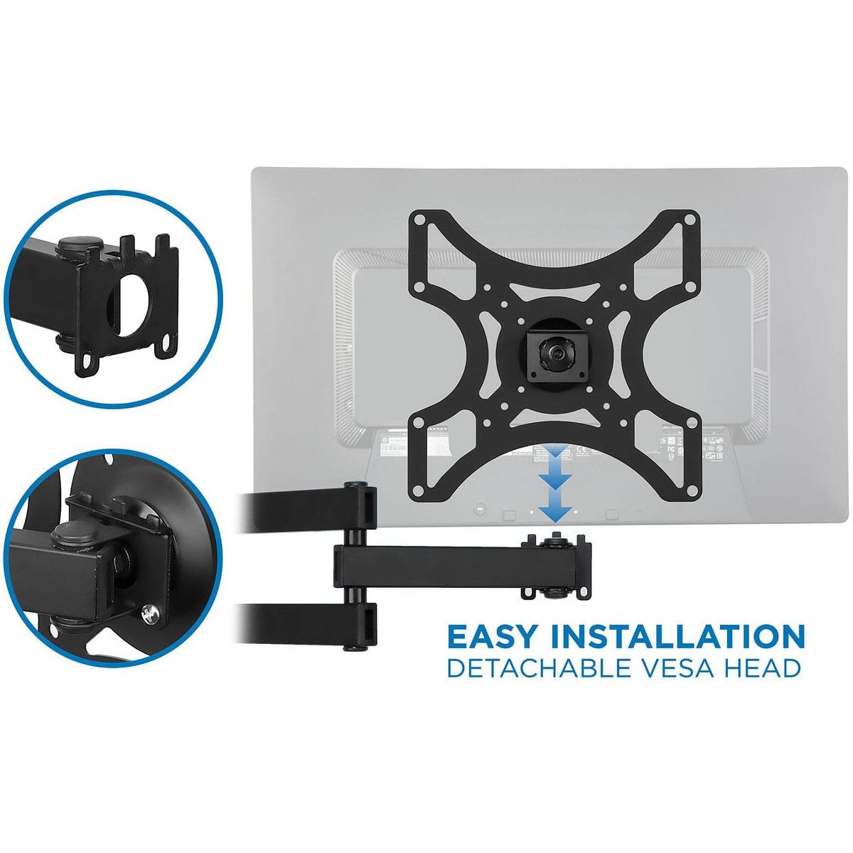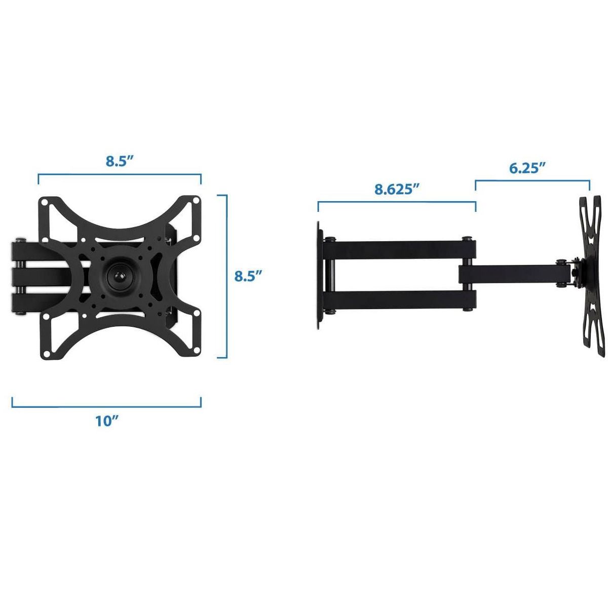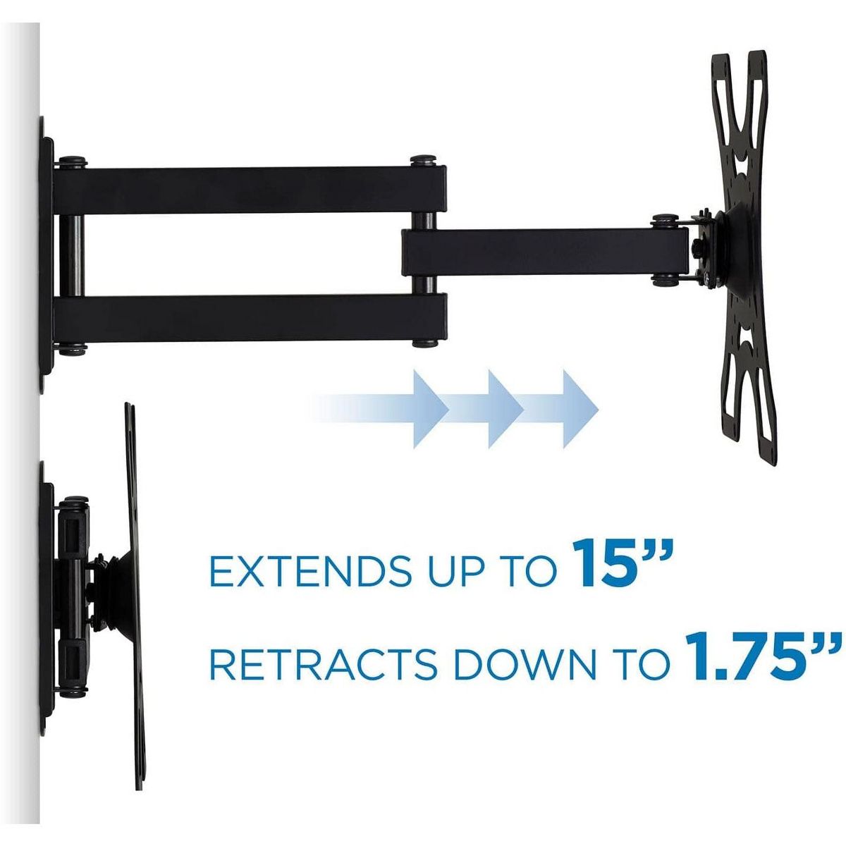 This full motion mount is designed so you can position your TV perfectly for a better way to watch. The solid steel construction and dual arm design keeps your TV safely mounted and does not sag while holding TVs under 55lbs. The wall plate is designed so you only need one wall stud to safely hold your TV and features a detachable VESA head to make the installation process even easier.