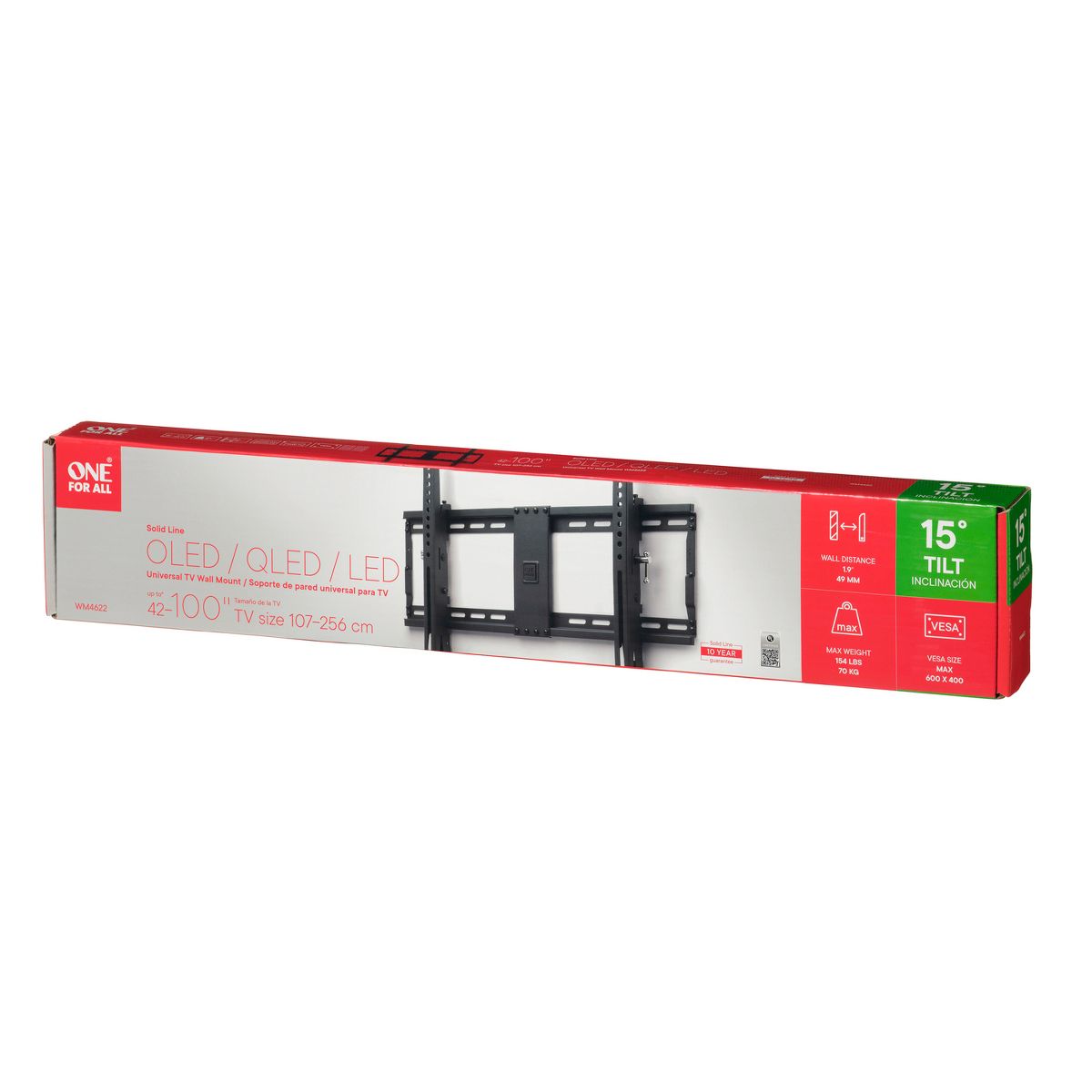 This One For All® TV Wall Mount with 15° tilt adjustment fits most TVs from 42 in. to 100 in. and is compatible with VESA® sizes up to 600 x 400. This modern wall mount allows fixed wall-to-TV distance of 1.9 in. (49 mm). The SOLID Series line of wall mount features a robust design. All mounting materials are delivered with the TV bracket for an easy installation._
