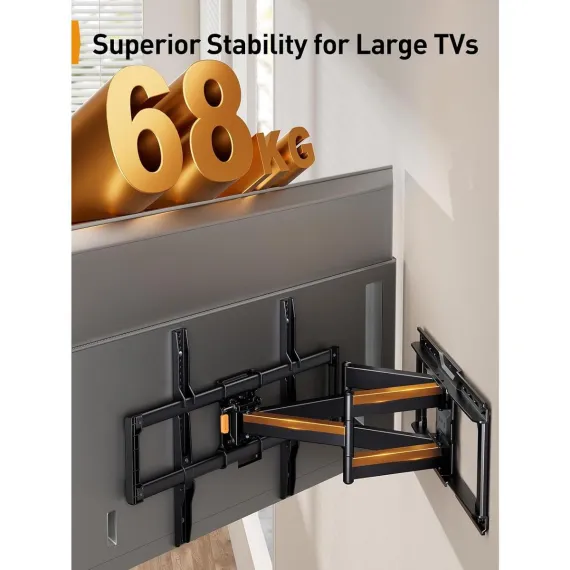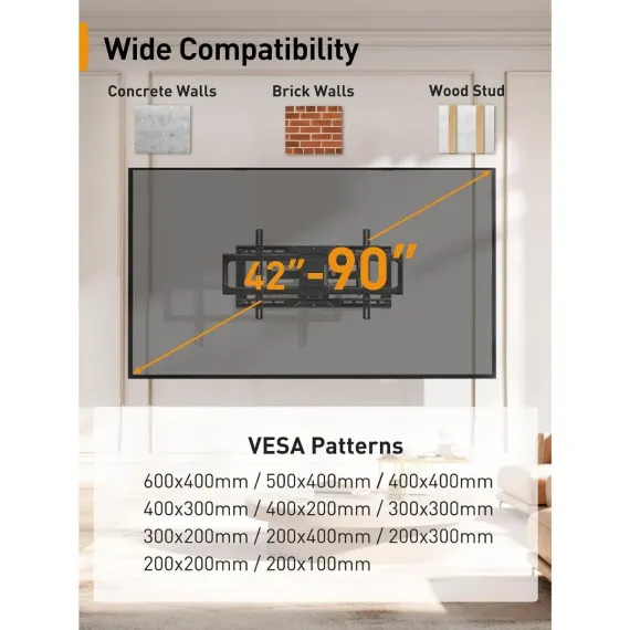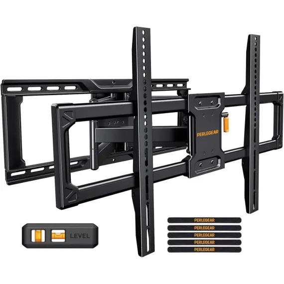 The Perlesmith heavy-duty wall mount TV bracket features upgraded high-strength steel, boasting 50% enhanced stability for ultra-large TVs weighing up to 150 lbs. It is compatible with 42" to 90" screens and VESA patterns from 200x100 to 600x400mm, and can be mounted on 12" to 24" wood stud walls, solid concrete, or brick. Installation is quick and easy, with a handy drilling template and a preassembled front support to reduce steps by 30%. Enjoy maximum flexibility with a +/-65° swivel, allowing you to extend your TV 22" from the wall or retract it to just 2.89". Our U.S.-based support team is ready to assist with any questions you may have.