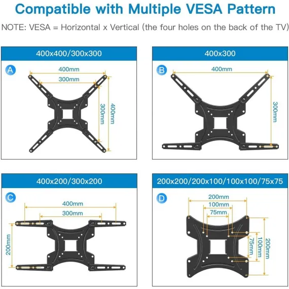 Upgrade your viewing experience with our universal TV wall mount, compatible with most 26" to 55" TVs weighing up to 66 lbs and VESA patterns from 75x75mm to 400x400mm. It fits major brands like Samsung, LG, Sony, TCL, and more. Ensure to check your TV's specifications before purchase as it can be mounted on single wood studs and concrete or brick walls.This mount offers multiple viewing angles, tilting 5° upward and 15° downward to minimize glare, while also swiveling 90° left or right based on TV size and seating position. It extends up to 17 inches and retracts to just 2.2 inches, allowing for an optimal viewing experience.Constructed from premium steel, our sturdy TV bracket has been stress-tested to hold four times its rated weight per UL standards, ensuring safety and reliability for your TV. Installation is quick and easy with the complete hardware kit, and our friendly, detailed installation guide makes setup straightforward and even entertaining.If you have questions about input blocking or VESA compatibility, our excellent customer service is here to help, complete with four extender brackets for various VESA ranges. Contact us today to find the perfect TV wall bracket for your needs!