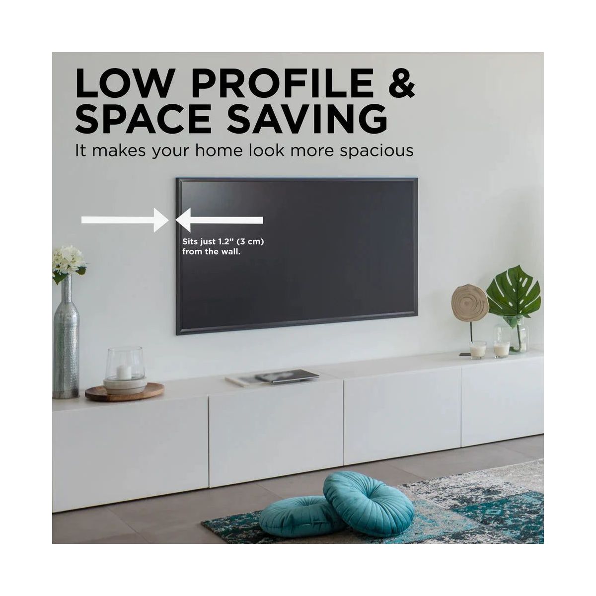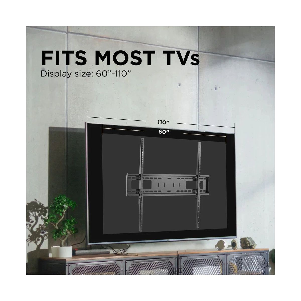Safely mount your large TV to the wall for a sleek look with the ProMounts Low Profile Fixed TV Wall Mount, with VESA compatibility and solid metal construction. Low Profile Flat TV Wall Mount The ProMounts Flat TV Wall Mount has a full metal construction with thicker steel than other wall mounts on the market, so you can have full confidence mounting large TVs to the wall. Safely mount TVs and monitors ranging from 60 inches to 110 inches, weighing up to 165 lbs. The ultra slim design holds your TV just 1. 2 inches from the wall for a sleek, modern look. Sleek, Versatile Design With its ultra-slim profile, the ProMounts Fixed TV Wall Mount is perfect for any living room or entertainment space. Clear up space on your entertainment stand for a clean, modern look, or swap out your TV stand entirely with a sleek floating shelf for a minimalist, space saving TV setup. Safe TV Wall Mount Wall mounting your TV is a great way to protect your TV from bumps and tipping. The stands that come with large TVs offer very little protection against tipping, which can be a hazard in homes with pets or young children. The locking TV brackets and ultra strong construction of this TV flat mount ensure your TV is secure, keeping your television and your family safe. Easy to Set Up and Install All ProMounts TV stands and TV mounts are designed around the consumer. Installation is simple, with easy-to-follow instructions and all hardware included and labeled. The open design gives easy access to ports and cables, making setup a breeze. It is compatibile with TVs using VESA patterns 200x200 to 900x600, meaning you can use this TV wall mount with nearly all major TV brands.