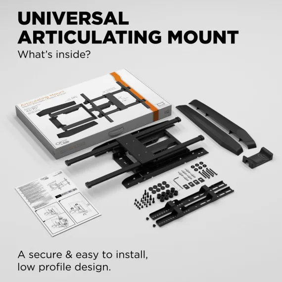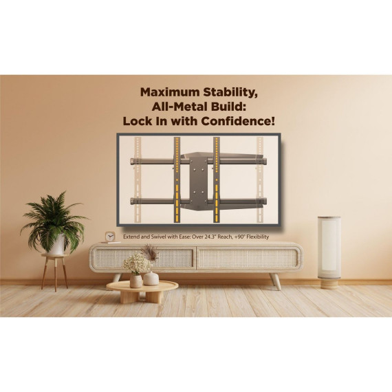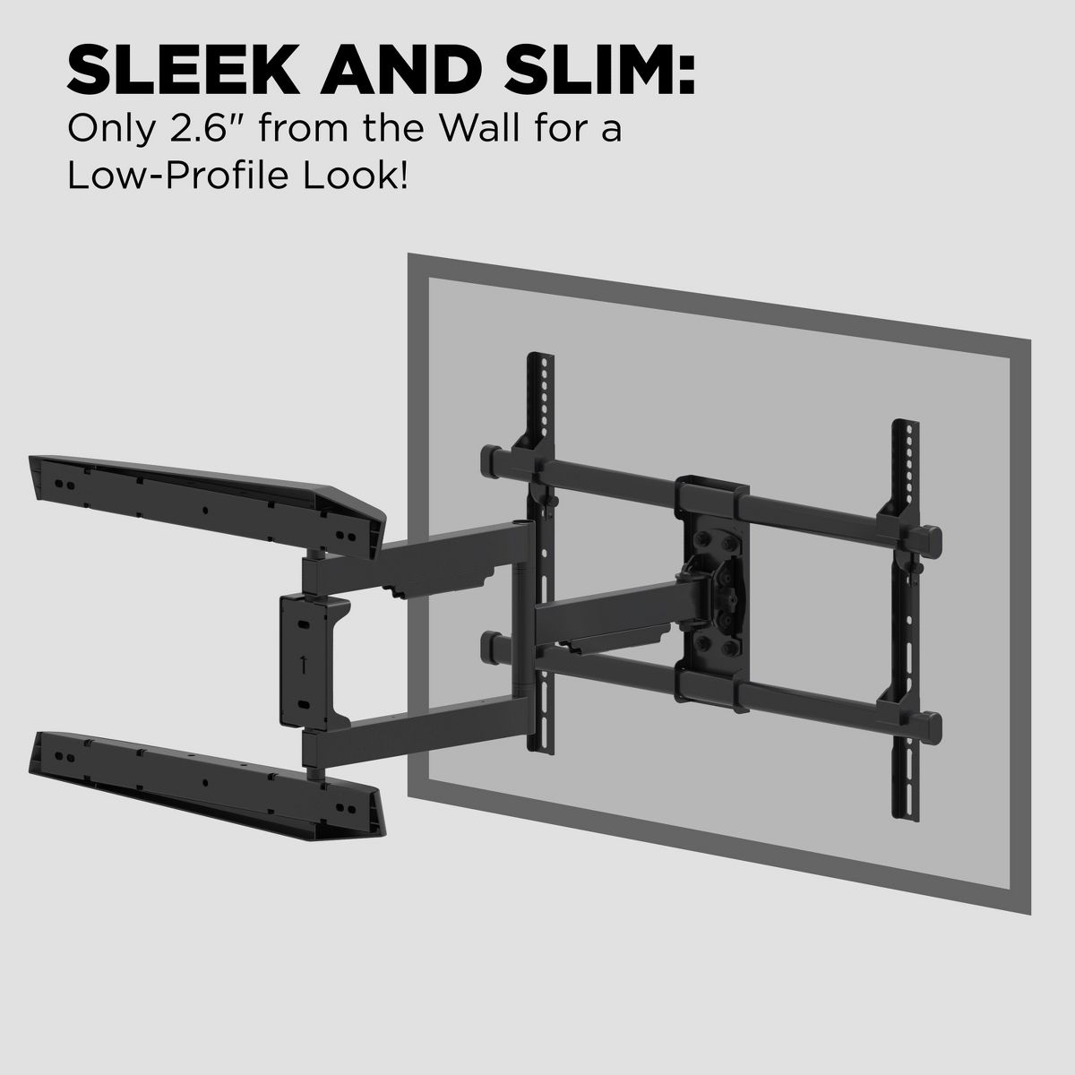 Show off your TV with the versatile ProMounts Full Motion TV wall mount. The single-arm design makes installation easy and allows a wide range of mobility. Full Motion TV Wall Mount Take full control over the position of your TV. A full motion TV wall mount is perfect for large rooms or areas with multiple viewing angles because of the wide range of adjustment it provides. The dual-jointed arm on the ProMounts Full Motion TV mount provides a full 180 degree of swivel and easily extends from 2. 6 in. to 24. 3 in. The tilt adjustable range of -15 degrees to 5 degrees eliminates glare in bright rooms and opens up possibilities for new viewing angles. Safe and Durable TV Mount Don't rely on the cheap and unstable stands that are included with your TV. Instead, securely mount your TV to the wall and protect it from bumps and tipping. The strong metal construction and double-stud design of the ProMounts TV mount let this wall mount reliably support TVs up to 75 in. and weighing up to 80 lbs. Sleek, Modern Design The sleek, matte-black design of this TV mount works with any style room. The included base plate cover and built-in cable management hide unsightly hardware and keep cords organized. The offset wall plate lets the entire arm fold into the base, for a sleek look when not extended. Whether you are trying to save space on your TV stand, mounting your TV above a fireplace, or going for a clean and modern look in your living room, a high quality TV wall mount is a great option. Easy-To-Install TV Mount ProMounts wall mounts are simple and straight-forward to set up. Included with the mount are easy-to-follow instructions and all necessary hardware for installation. The versatile VESA pattern is compatible with 200x200 to 600x400 VESA mount TVs, so it can be used with most TV and monitor brands.
