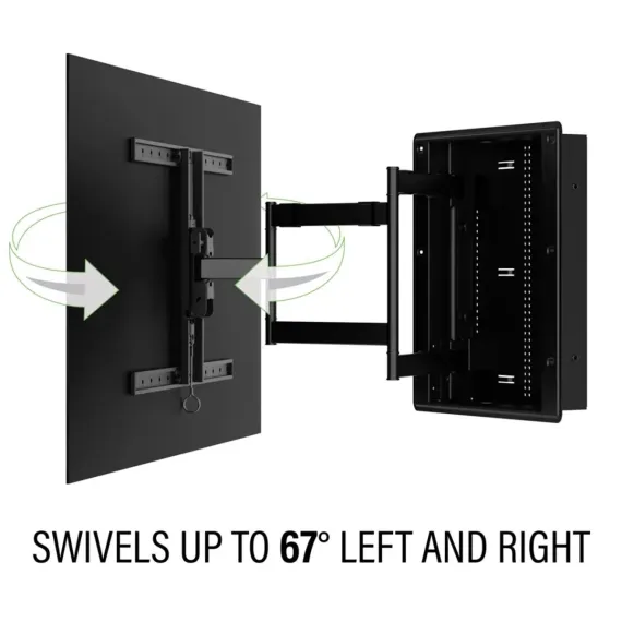 The VIWLF128-B2 Large In-Wall Full Motion mount provides the optimal viewing experience with space for AV components built in. This full motion mount extends 28" with up to 67 of swivel left and right and sits just .5" from the wall when recessed. Mount arms fold into a 20" enclosure that can double as AV storage for streaming devices switches and more. With knockouts to add power (not included) and cable management The VIWLF128 offers a stylish industrial design that achieves the ultimate all-in-one AV experience.