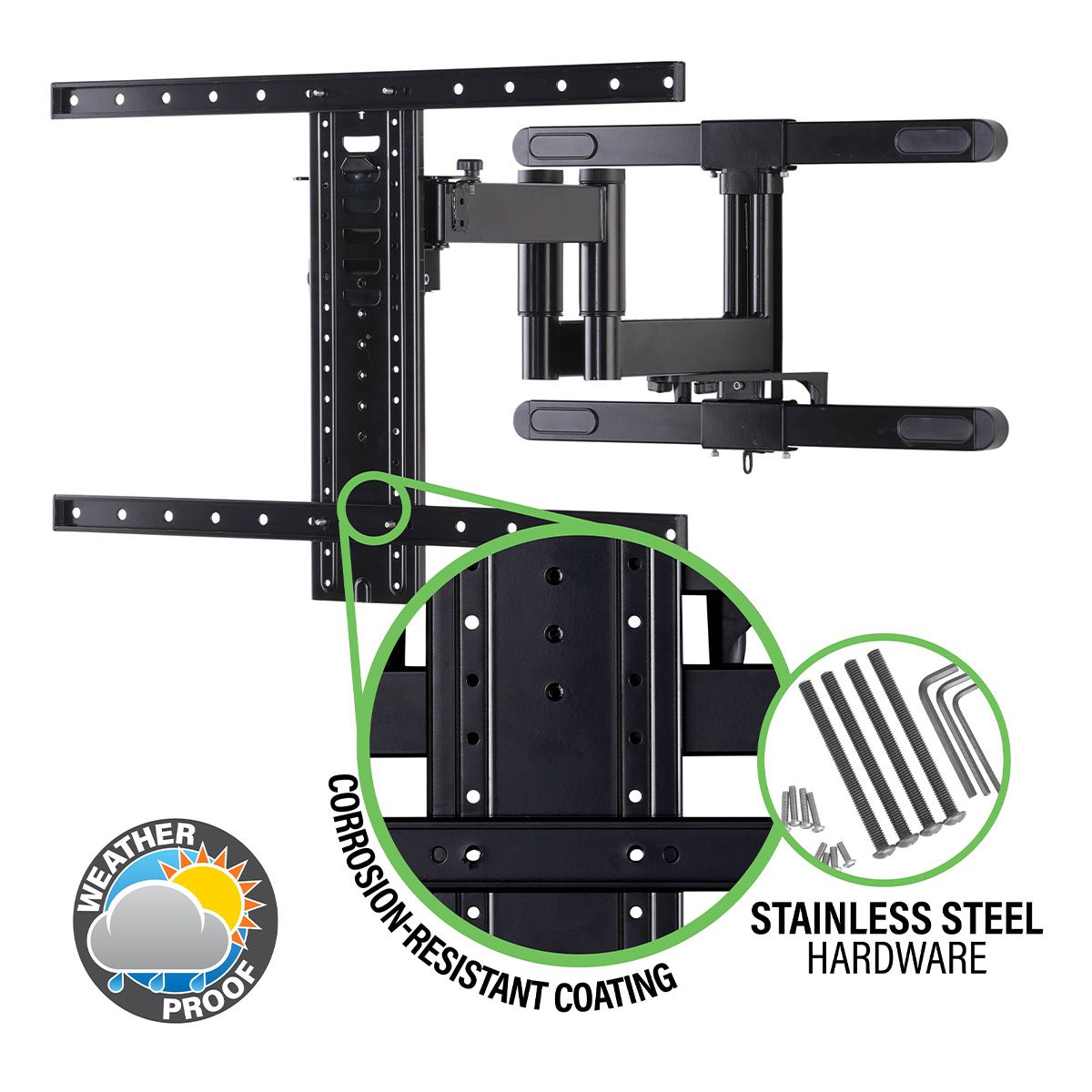 Introducing the Outdoor Premium Full-Motion TV Mount - Designed to handle the elements this weatherproof mount is built with a corrosion-resistant coating and stainless-steel hardware for durability. 25-inches of extension offers flexible cable access and the perfect viewing angle so you get the best seat wherever you are. Motion lock knobs keep your TV securely in place to prevent unwanted movement. With Virtual Axis fingertip tilt technology you can tilt and swivel your TV to reduce glare and improve the viewing angle. The slim profile of this mount blends seamlessly into your dcor placing your TV just 2.74 inches from the wall for a sleek and stylish look. Upgrade your outdoor entertainment space with the perfect mount.