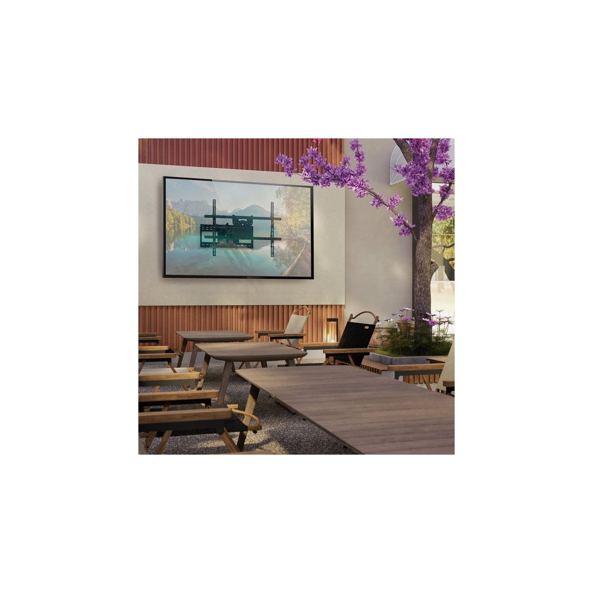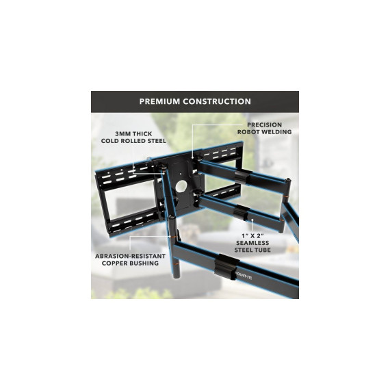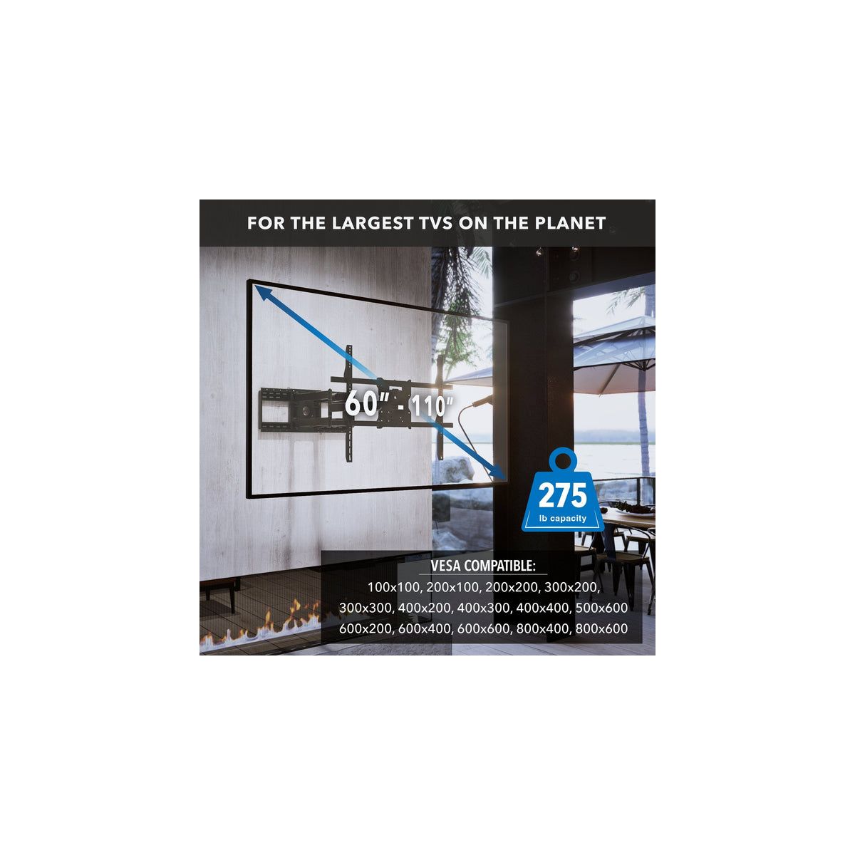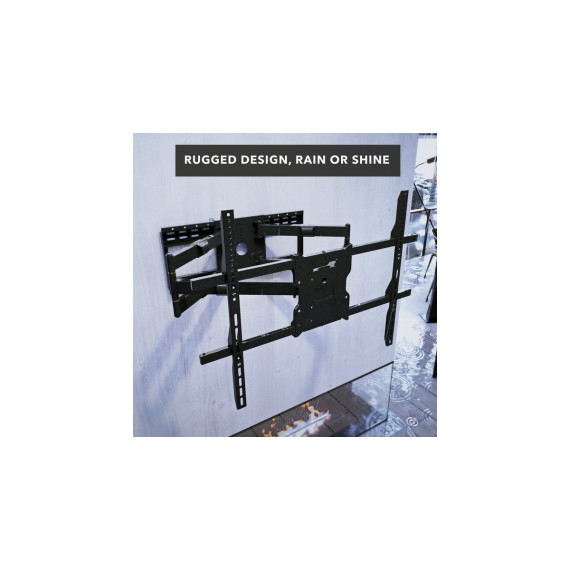 Introducing The Beast Weatherproof Heavy Duty TV Wall Mount, designed to bring robust, reliable performance to your outdoor entertainment spaces. This mount is expertly crafted with resilient weather-resistant materials, including stainless steel hardware and a durable outdoor powder coating, making it the ultimate choice for patios, decks, or commercial outdoor areas where durability is essential. Built to support large displays from 60" to 110" and up to 275 lbs, The Beast ensures exceptional stability, safely anchoring your screen for years of outdoor enjoyment. With an incredible 38.6" extension from the wall, plus comprehensive tilt and swivel capabilities, you can enjoy optimal viewing angles regardless of your setup. The innovative horizontal slide technology within the full-size backplate allows precise screen positioning, simplifying installation on both 16" and 24" stud configurations. Its extensive VESA compatibility makes this versatile mount compatible with a wide range of TVs and the built-in safety brackets ensure secure mounting.