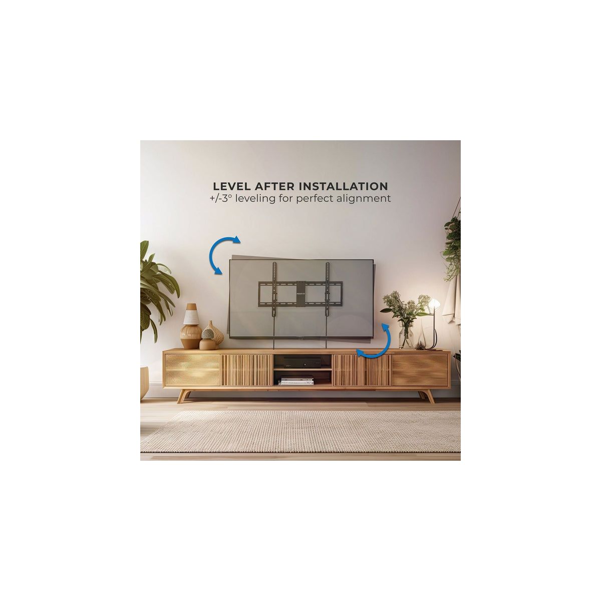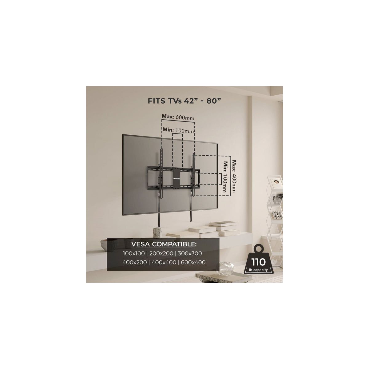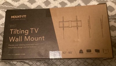 This tilting TV wall mount is recommended for TVs between 42" and 80" and securely supports up to 110 lbs, ensuring stability and safety for a wide range of television sizes. The tilt range of +7 to -11 offers customizable viewing angles to reduce glare and enhance comfort, while the low 1.9" profile ensures a sleek, modern look that keeps your TV close to the wall. Post-installation leveling adjustments of +/-3 allow for perfect horizontal TV alignment on any wall. With compatibility for a wide variety of VESA patterns between 100x100mm and 600x400mm, this mount ensures it fits most TV brands and models. Its durable and sturdy design provides long-lasting support, and the classic black finish complements any home dcor, blending seamlessly with most TV designs. Includes all mounting hardware.