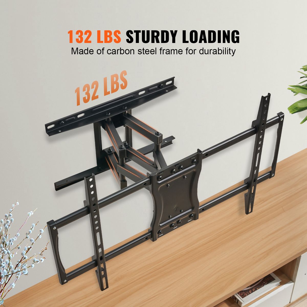 Strong Support for Your TVs: Our TV wall mount is built with carbon steel with a durable matte finish, providing sturdy and reliable support. It is wear-resistant and built to last, with a max weight capacity of 132 lbs. Say goodbye to wobbling and tipping.