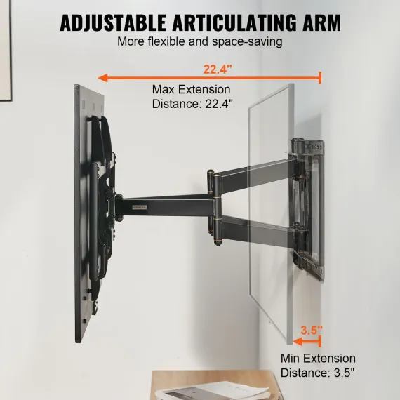 Space-saving Design: Our wall mount TV bracket features four articulated arms, allowing it to be adjusted from 3.5"/9 cm to 22.4"/57 cm away from the wall, saving valuable space in your room. We also provide Velcro for convenient cable management, keeping everything tidy and organized.