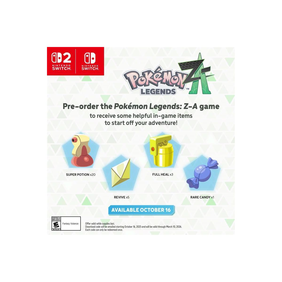 Live as a Pokémon Trainer and help protect the peace in Lumiose City—enhanced for the Nintendo Switch 2 system! Lumiose City—a home for people and Pokémon alike. Thanks to an urban redevelopment plan driven by Quasartico Inc., the lush greenery of verdant parks intermingles with facilities using the latest cutting-edge technology. A lot has changed here since the days of the Pokémon™ X and Pokémon Y games! Choose Chikorita, Tepig, or Totodile as your first partner Pokémon, and then set off on a grand adventure! Your journey will take you to all manner of sights in the streets arrayed around Prism Tower, including shops, restaurants, and places called wild zones—where Pokémon roam free. As you catch, train, and battle Pokémon, there will be plenty of people to meet too—like AZ, the enigmatic owner of Hotel Z, and Team MZ, the crew that aims to keep Lumiose a peaceful place. And with performance upgrades for the Nintendo Switch™ 2 system, you’ll experience Lumiose City like never before: with enhanced resolution and frame rates! Catch, battle, and Mega Evolve—all in real time! Step onto the battlefield and command your Pokémon directly—there are no turns! For the first time in the Pokémon RPG series, Trainers and their Pokémon can both move around in real-time battles, and your Pokémon will unleash their moves when you tell them to. Strategically swapping out your Pokémon and accounting for each move’s timing and area of effect will greatly help you in this new style of battle. Harness the power of Mega Evolution! Unleash your Pokémon’s hidden energy to temporarily transform its appearance, enhance its capabilities, and perhaps even change its type. Use this power wisely to try to overcome your toughest challenges, like those posed by the rampaging Rogue Mega-Evolved Pokémon across Lumiose City. Investigate these dangerous incidents so you can put a stop to them—you may even encounter new Mega-Evolved Pokémon along the way! Compete in the Z-A Royale when night falls—or battle with other players in the Z-A Battle Club You’re invited to join the Z-A Royale, a competition for Pokémon Trainers to test their skills and determine who’s strongest. Each night, a battle zone for the competition will appear. Prepare yourself by spending the day catching and training Pokémon, then venture into the battle zone to take on other Trainers. Be strategic and complete bonus card challenges as you battle to speed up your climb from Rank Z to Rank A. Reach the top, and you might just have a wish granted. You can also test your skills against friends or Trainers around the world in the Z-A Battle Club.
