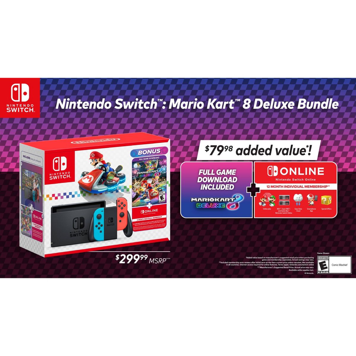 This bundle has everything you need to start playing right away, including a Nintendo Switch™ system with Neon Red and Neon Blue Joy-Con™ controllers. Plus, enjoy an added value of $79.98* with a full download of the full Mario Kart™ 8 Deluxe game and a 12-month Nintendo Switch Online Individual Membership**.