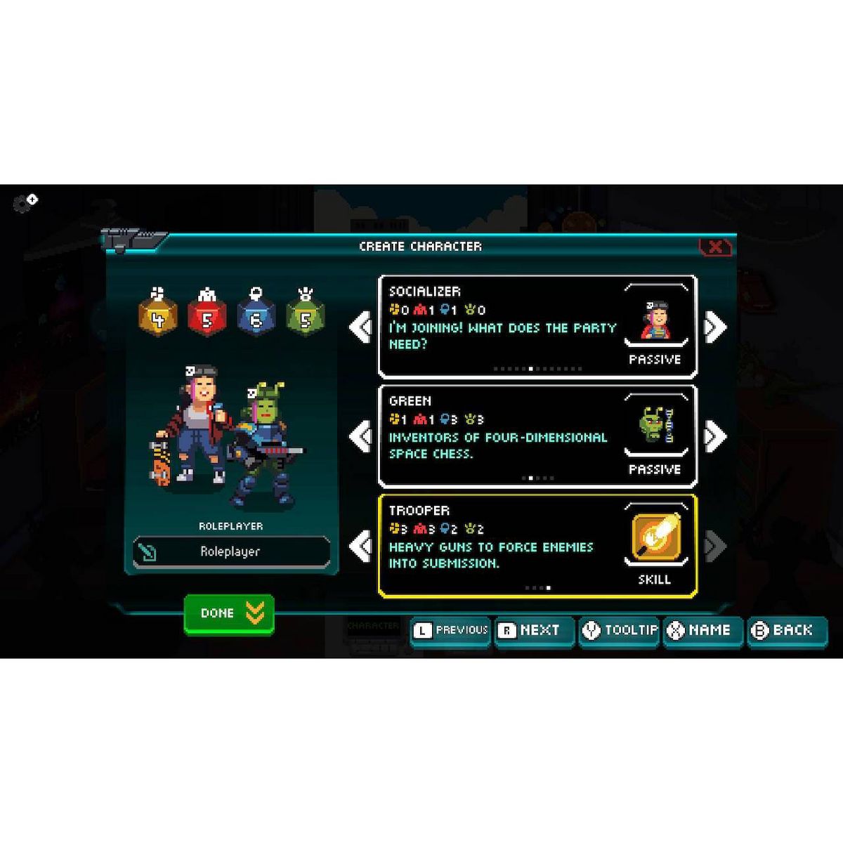 The player creates their own Game Master and builds a party to play through a number of weird and exciting campaigns, earning prestige and unlocking new skills along the way.