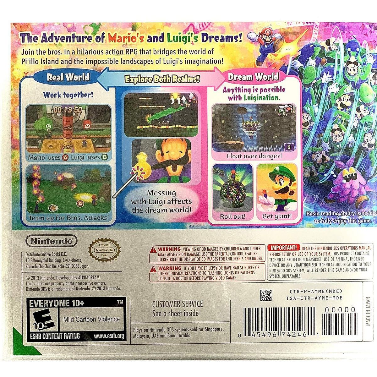 USA NTSC version game with World Edition packaging as pictured. No Region Restrictions. Mario and Luigi embark on the adventure of their dreams in a hilarious action RPG that combines the real world with the wild landscapes of Luigi’s imagination. In Luigi’s dreams, anything is possible - legions of Luigis morph into forms like a bouncy tower or a wrecking ball. You can even poke a sleeping Luigi to alter events in his dream world.