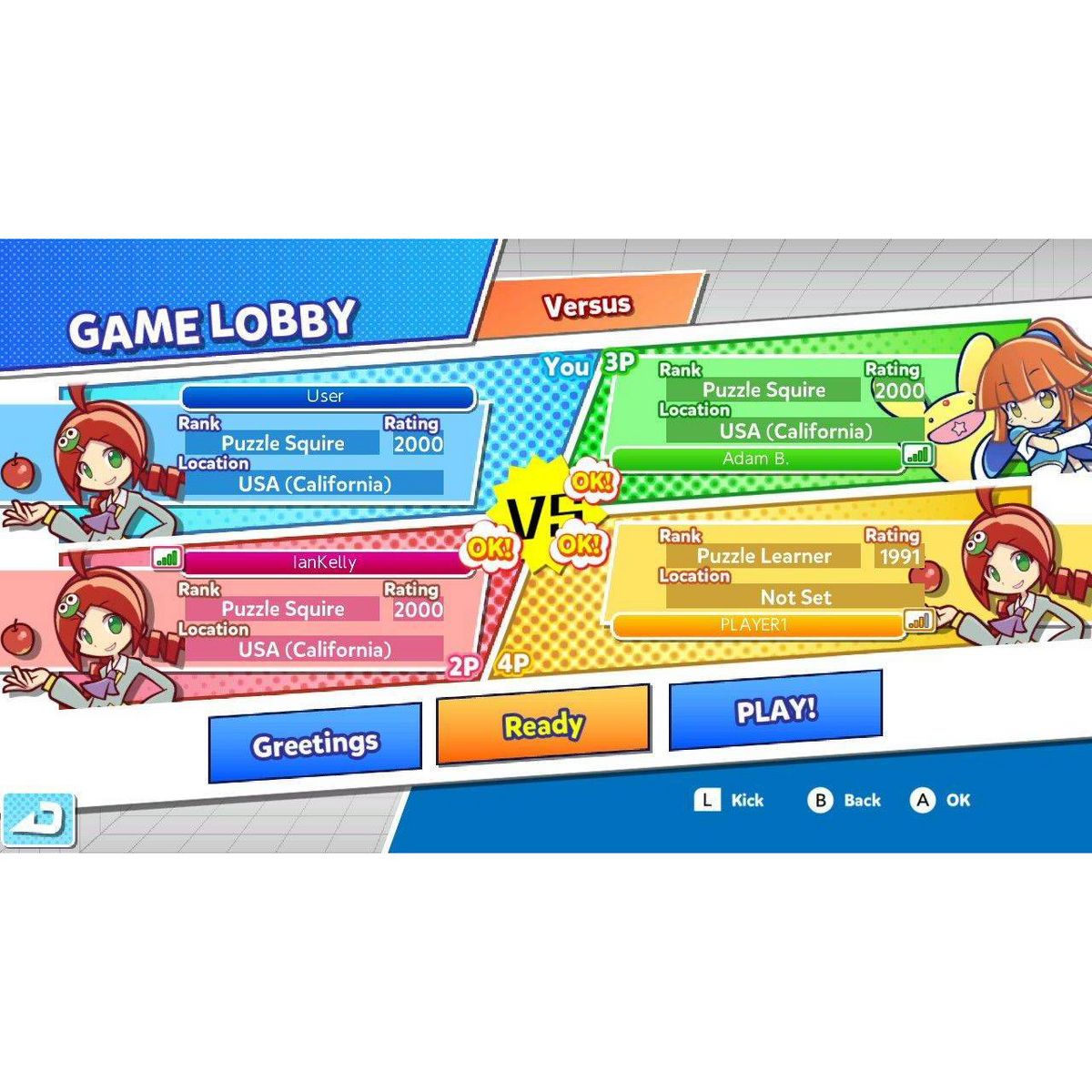 Two puzzle game juggernauts collide as Tetris , one of the largest-selling and recognized brands in gaming history, and Puyo Puyo from SEGA have combined to create a fun-to-play, fast-paced, competitive party game like no other! Features: Adventure – Single-player mode offers ten unique acts, each with ten stages featuring different characters from the Puyo Puyo and Tetris universes. Each stage contains unique challenges players will need to overcome in order to win and move on! Multiplayer Arcade – For up to four local players, Multiplayer Arcade offers a wealth of variety that will bring out players' competitive nature! Versus – Players compete head-to-head in either Puyo Puyo or Tetris to fight in the puzzle fight of their life. Swap – Players' abilities are put to the ultimate test when they compete on both Puyo Puyo and Tetris boards, which switch back and forth at set intervals. Fusion – A true hybrid game where players compete with Puyos and Tetriminos together on the same board, requiring deft, on-the-fly thinking to become victorious. Big Bang – It's a race to the finish as players compete against each other to clear unique challenge boards as quickly as possible to win. Party – Players compete on Puyo or Tetris boards, but the puzzles feature special items that when activated either help players or harm their opponents. Online – Players can try their puzzle skills on a global scale by playing any of the multiplayer modes with up to four players online, in Puzzle League or Free Play modes. Puzzle League – Increase player rating, earn ranks and aspire to new leagues in this mode for competitive enthusiasts. Free Play – A more casual experience where records aren't kept and players can customize matches with unique settings, and invite their friends to play. Replays – Players can save and upload any online matches to show off to their friends, or search other players' replays using the tag and filtering system to see how they tackle matches. Solo Arcade – Play any of the Multiplayer Arcade modes against the CPU in Battle or Endurance matches, or try the single-player Challenges! Battle – Substitute human players with 1-3 CPU opponents to fight against simultaneously. Endurance – Go the distance in a one-on-one gauntlet of never-ending CPU opponents, racking up as many wins as possible. Challenge – Forget about the opponents and put skills to the test with Sprint, Marathon and more, like the quirky Tiny Puyo, which shrinks down Puyos to fit even more on the board.