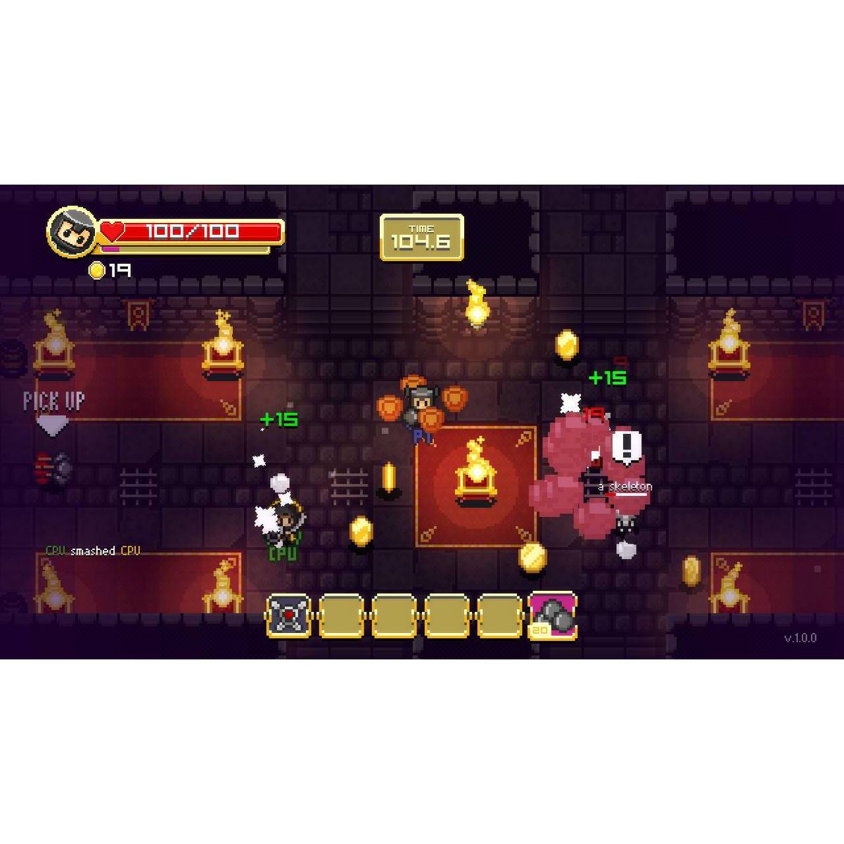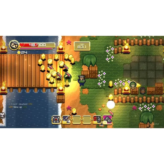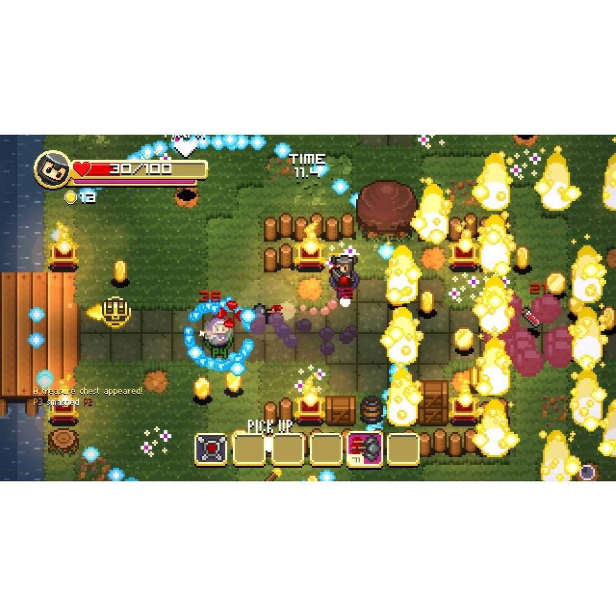 Super Treasure Arena is a unique mix of retro-inspired arcade action and objective-based arena shooters for up to 4 players. The result is a frantic game where collecting and stealing coins from your opponents is the key to victory.