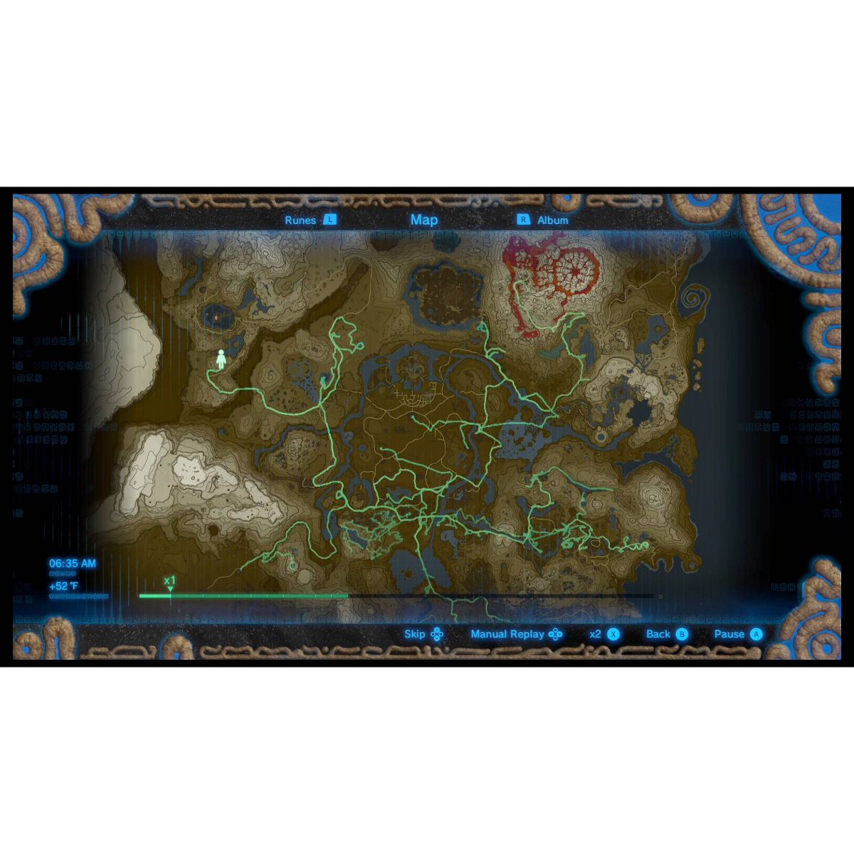 View the path you've taken on your journey. It will record your journey for up to 200 hours of gameplay. Use this feature to find shrines and Koroks! You can even manually adjust the replay speed.
