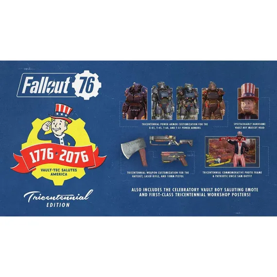 Tricentennial Fallout 76 - Tricentennial Edition for PlayStation 4 Bethesda Game Studios, the award-winning creators of Skyrim and Fallout 4, welcome you to Fallout 76, the online prequel where every surviving human is a real person. Work together, or not, to survive. Under the threat of nuclear annihilation, youll experience the largest, most dynamic world ever created in the legendary Fallout universe. Reclamation Day, 2102. Twenty-five years after the bombs fall, you and your fellow Vault Dwellerschosen from the nations best and brightest emerge into post-nuclear, Genre role playing game Features You will Emerge! Multiplayer finally comes to the epic open world RPGs of Bethesda Game Studios. Create your character with the S.P.E.C.I.A.L system and forge your own path in a new and untamed wasteland with hundreds of locations. Whether you journey alone or with friends, a new and unique Fallout adventure awaits. Mountain Splendorland!