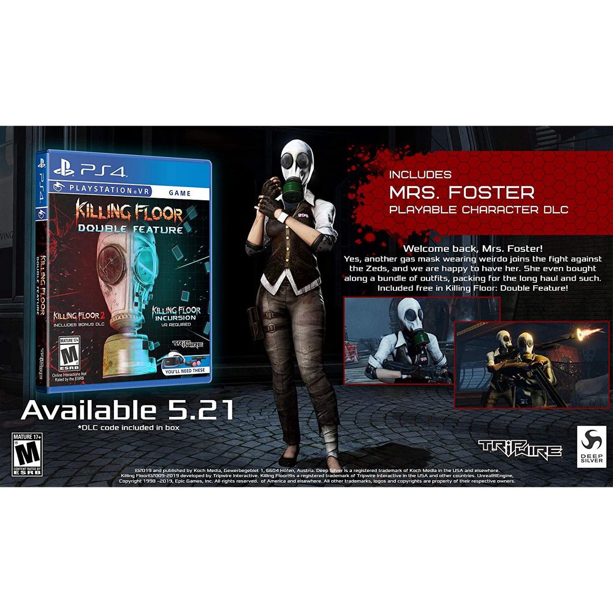 Killing Floor: Double Feature is the ultimate bundle from Tripwire Interactive that delivers two great games from the Killing Floor Universe for one great price! Play solo or co-op with up to 6 players in Killing Floor 2 as you tackle hordes of ferocious Zeds using an absurd arsenal of weapons, or get up close and personal using PSVR in Killing Floor Incursion, where you and a friend can unleash mayhem in a variety of modes, including a full-fledged narrative campaign. PlayStation VR is required to play Killing Floor Incursion.