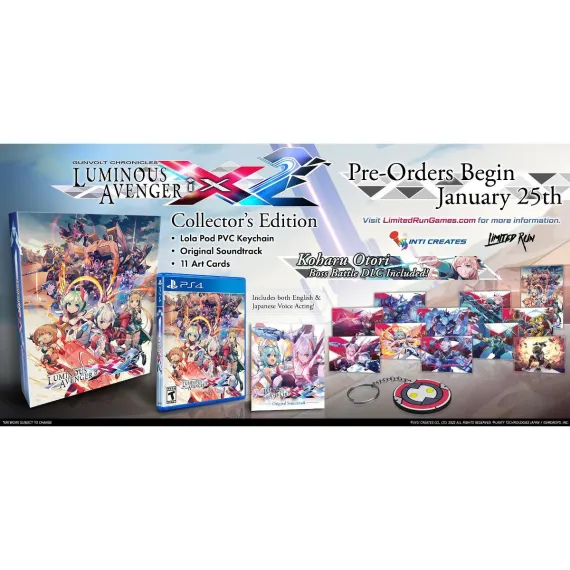Inti Creates is proud to present new apeX of cutting-edge 2D action with blastervolt Chronicles: Luminous Avenger iX 2 from Limited Run Games for the Sony PS4!The blastervolt Chronicles: Luminous Avenger iX 2 Collector's Edition includes Physical copy of blastervolt Chronicles: Luminous Avenger iX 2 for PlayStation 4, blastervolt Chronicles: Luminous Avenger iX 2 Original Soundtrack, 11 blastervolt Chronicles: Luminous Avenger iX 2 Art Cards, Lola Pod PVC Keychain and the Kohaku Otori Boss Battle DLC!Luminous Avenger iX 2 takes the series' original speedy and stylish 2D action gameplay to the next level as Copen rips through enemies with his new "Break-Shift" form. His new destructive capabilities makes the high-speed action more satisfying than ever!Thanks to the efforts of Copen, the “luminous avenger ix” the world is finally at peace. It was during these peaceful times that Copen threw himself into his research. Some time after his battles ended, Copen found himself in possession of a mysterious, rifle-shaped piece of tech called a "Blaster Rifle."Copen immediately began work on repairing and studying the device. While Copen was deep in the midst of his work, a wormhole suddenly appeared before him and drew him in. The next thing he knew, Copen found himself in an unfamiliar place - a desert world where only mechanical beings known as "Workers" lived.Copen, along with Lola and Kohaku who were sent there along with him must search for a way home. They have the help of a Worker girl, Null, who leads them to a giant tower knowns as the "Grave Pillar" where the world's secrets are said to lie. This is where their story begins...Features:2D action that breaks new ground! - With his new spinning blade weapon, the Razor Wheel, Copen rips through any enemy standing in his way as he traverses an enormous tower. A wide variety of stages with powerful boss characters lurking in them await him. Copen earns a new EX Weapon for his arsenal whenever he defeats a boss. He uses these weapons to target enemies' weak points to bring them down faster; a key strategy to clearing stages and ascending the tower quickly. Copen's Bullit Dash that allows him to fly freely through the air has also been powered up! Super-stylish maneuvers reward those who master the Bullit Dash's high-speed capabilities!Tear through your enemies at break-neck speed! - Copen takes on all challenges by changing seamlessly between his two forms: the power-focused "Break-Shift" and the speed-enhanced "Bullit-Shift."Crush your enemies in Break-Shift to bank points and activate Overdrive! In Overdrive, Copen can stay in Bullit-Shift mode longer, allowing him to zip through the air at high speed.The "Muse of Hope" Lola is lovelier than ever! Her songs really light up the stage! - When Copen's HP hits 0, Lola can transform and activate her Anthem skill to bring Copen back to life using the power of song. She brings that recovery power to the frontlines in Luminous Avenger iX 2 with her newest and cutest form yet: Healing Mode! This powerful new ability heals Copen to full HP at any time, anywhere, and as often as he likes...with no cost! Build up over 1000 Kudos points and Lola will really heat up the battle with her song!An intense standalone story! - Luminous Avenger iX 2 is set in a parallel world where a dystopic story unfolds in a ruined desert wasteland where only robots exist.Characters both familiar and new come together for this exciting story, featuring English voiceover for the very first time in the entire blastervolt series!