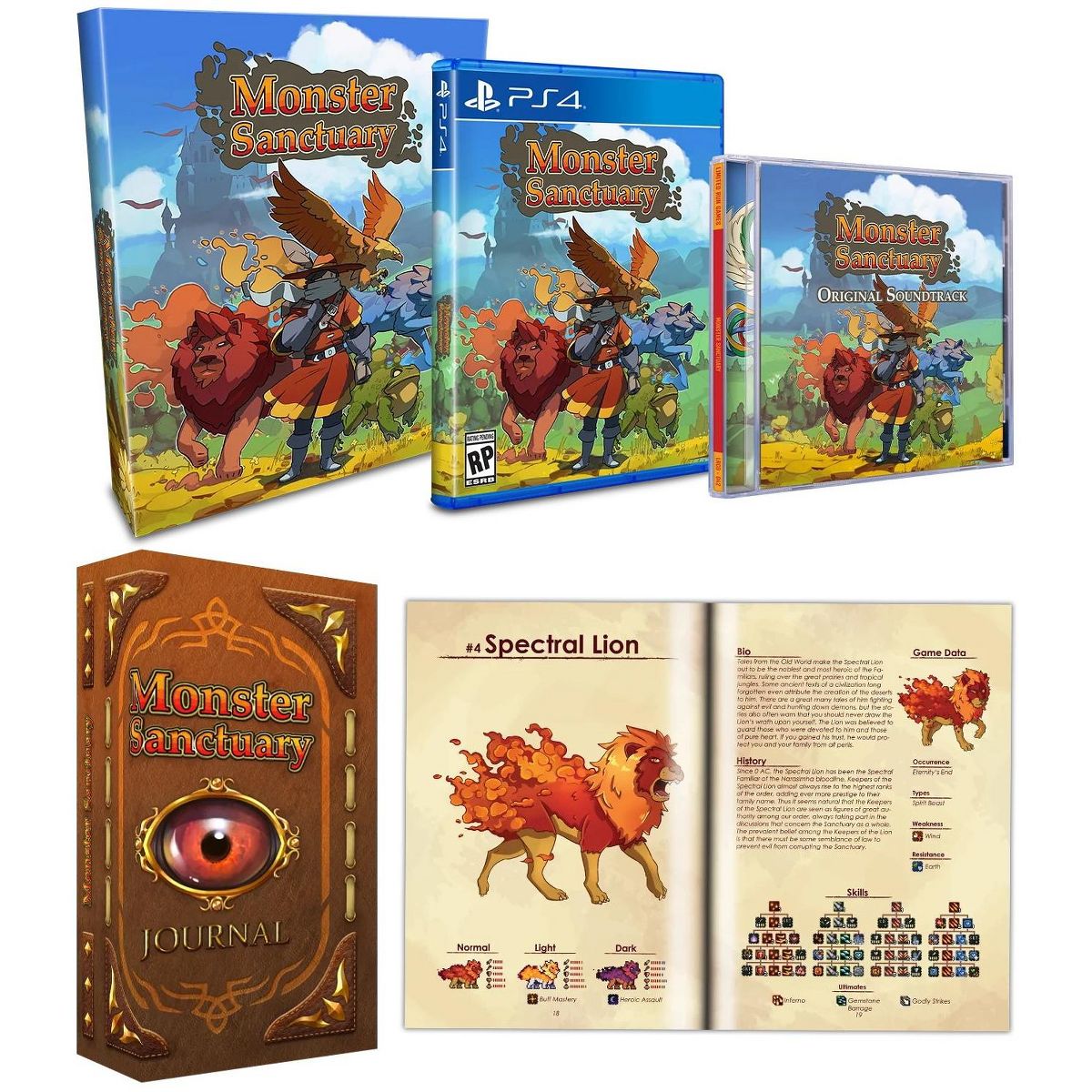 Monster taming meets metroidvania. Collect, train and battle monsters in the lovely side-scroller pixel world of Monster Sanctuary from Team17 and Limited Run Games for the Sony PS4.Monster Sanctuary Collector's Edition includes Physical Copy of Monster Sanctuary on PS4, Monster Sanctuary Collector's Edition Box, Monster Sanctuary 2-Disc OST and a 200+ Paged Soft Cover Monster Journal Artbook! Choose your spectral familiar and follow in your ancestors’ footsteps to become a Monster keeper and save the Monster Sanctuary.Embark on an epic adventure using the powers of the monsters you collect, and the team you build, to unlock an ever-expanding world. On your quest to become the ultimate Monster Keeper you’ll unravel the cause of a mystery that threatens the peace between humans and monsters.Master the Monster Sanctuary!Delve deep into the Metroidvania inspired world of Monster Sanctuary, explore the expansive lands and call upon your monsters to lend their aid in and out of combat! Use their unique skills to fly, ride and brute force your way through environmental puzzles and precise platforming! The world is yours to traverse as you see fit, are you ready to take on the Sanctuary?Collect, Evolve and Battle!Your quest begins with a choice of an ancient spectral familiar, a wistful monster who will guide your first steps into the sanctuary. They will be by your side as you catch your first of 111 monsters. From here it is up to you to hatch, collect, evolve and train monsters from across the Sanctuary! Each possesses unique abilities and a skill tree for you to customise as your team grows in strength.Battle it out in Strategic Combat!Strategically order your attacks for maximum efficiency, stacking your attacks to deal devastating combos! Try out different team combinations and make use of synergies between your monsters. Encounter formidable foes, endurance challenges and train an unbeatable team!Clash in PvP battles across the Globe!Face off in a test of skill and ability in online player vs player! Gather and train monsters, max out their skill trees and take on friends and foes in an epic battle to have the last monsters standing!Optional Game Modes for More Replayability!Added with the latest update, you can enable and combine optional Randomizer, Bravery and Permadeath game modes, making every playthrough a fresh and different experience!Features:Monster Sanctuary - Monster Sanctuary is on a region-free physical disc for the Playstation 4. Also works on the Playstation 5.Explore a Metroidvania Inspired World - The powers of your monsters will allow you to explore and expand the world. Cut down vines, smash down walls and glide over gaps- all with the help of your monsters.Assemble Your Team - Hatch collect and train monsters from across the world and build your team. Every monster has a unique skill tree to allow you to customize and tailor your party.Clash in Tactical 3v3 Combat - Strategically order your attacks for maximum efficiency, stacking your blows to create combos. Grind and find the best combo to earn the rarest monster eggs!Battle Monster Keepers Across the World! - Go head to head in a test of skill and ability in online player vs player! Gather and train monsters, max out their skill trees and take on friends and foes in an epic battle until your monsters are the last standing.