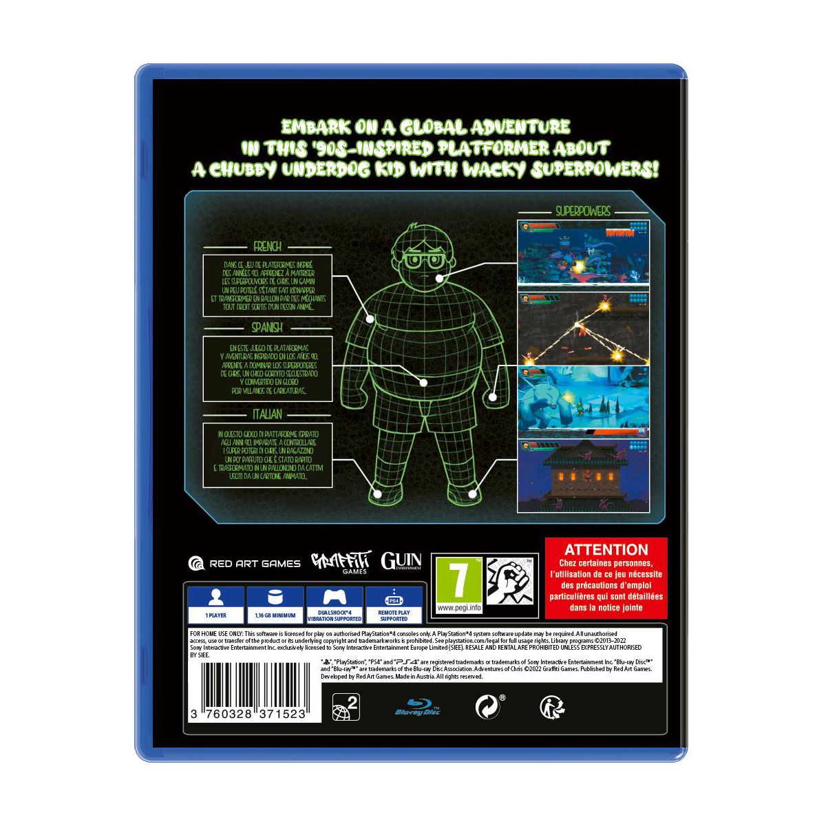 Embark on a global adventure in the ‘90s-inspired adventure platformer Adventures of Chris from Red Art Games for the Sony PS4. Help a chubby underdog kid with wacky superpowers battle bizarre villains, unlock and customize special moves and spells, and save the world! My name's Chris, and I'm so excited to tell you about my game! It’s a ‘90s-inspired adventure platformer about the totally normal adventures I went on as a chubby kid back in 1995 - traveling the world, learning useful abilities, and, naturally, getting kidnapped and turned into a balloon by cartoon villains.Thankfully, I escaped and learned to use my transformation as a kind of superpower. I got to learn all kinds of cool stuff - how to throw fireballs and lightning, how to bounce around like a basketball and rocket around the earth. It's a neat story...I think. I really hope you'll enjoy it - I had a lot of fun making it!Features:Snort out loud with a game chock-full of laughs.Float or fall through unique platforming challenges.Uncover a sinister story in a quirky, cartoon-like universe.Learn (or purchase) increasingly powerful spells and techniques.A variety of unlockable content and secrets to discover, including an in-depth backstory.Battle bizarre villains across the globe, including samurai cats, cyborg penguins and whiny vampires.Explore 9 locations around the world in any order you please, plus the Kingdom of Lost Balloons and more!Two additional full game modes, including bonus content - a more difficult and humorous Mean Mode, and Developer Commentary.Numerous difficulty settings, including ""Ridiculously Easy"" for players who prefer to never die, and ""Hard for No Reason"" for crazy people.Build Chris from a weak kid into the ultimate hero by upgrading him with unique special moves and abilities that you can customize to your style.