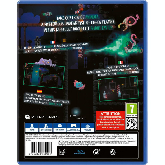 Akinofa from Pixel Lantern and Red Art Games for the Sony PS4 is an arcade shoot 'em up with Roguelite elements.Take control of Akinofa, a mysterious undead fish of green flames, in this difficult Roguelite shoot em' up!Beat as many enemies and get the highest score possible. Challenge your friends and the world Rankings!Every action counts! Even if you don't finish a level, every coin you collect will be in your treasury to use for permanent upgrades!Features:Online Rankings.Beautifully designed retro-inspired graphics.Extremely challenging, yet rewarding gameplay.Rogue-lite - With the gold, you collect you will be able to upgrade your ship's stats on the Game Over screen. These upgrades are permanent and will help you with future playthroughs.
