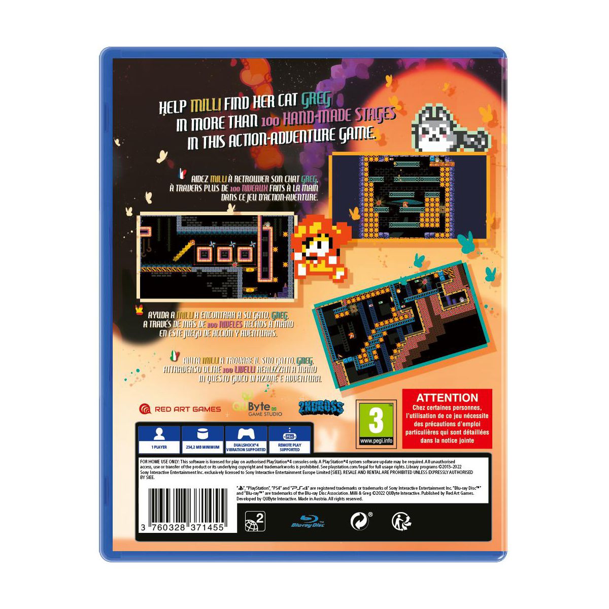 Milli & Greg from QUByte Interactive and Red Art Games for the Sony PS4 is a challenging platformer about a love story between a girl, Milli, and her cat named Greg.Greg has gone missing and it’s up to Milli to find him throughout the levels. The game contains more than 100 hand-made stages filled with obstacles that Milli will have to overcome.Milli&Greg is an Arcade platformer based on classic gameplay mechanics such as jumping, sliding and dashing.However, the addition of a physics-based feature that alters the gravity pull during levels make for a more challenging experience than expected!Features:Simple controls.More than 100 hand-made stages.Physics-based gameplay mechanics.Challenges that are both insane and rewarding.