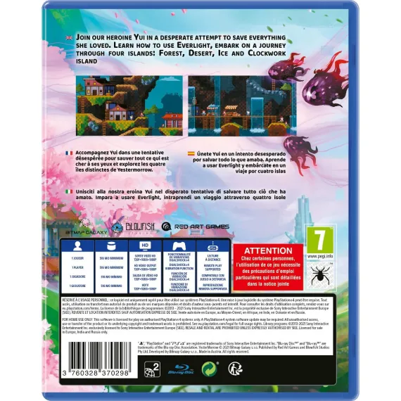 In YesterMorrow from Blowfish Studios and Red Art Games for the Sony PS4, follow Yui's journey into the past as she navigates parallel timelines to save her family and a world trapped in the Never-ending Night.YesterMorrow is a single-player time travelling 2D platformer, mixing action sequences with puzzle elements, all wrapped up in an engaging story about our young hero, Yui,who must save her family and to change the fate of a world that has been plunged into endless night.This can only be done by journeying into the past and repairing the mysterious Clocktower controlling the cycle of time.Her world - destroyed. Her family - kidnapped. Join our heroine Yui in a desperate attempt to save everything she loved.Learn how to use Everlight, embark on a journey through four islands (Forest, Desert, Ice and Clockwork island) and use time travel to overcome obstacles and access hidden locations.Free your family from the clutches of Shadows! Find out what really happened to the Sun and whether it can be reversed!Features:Locate hidden areas and collect power-ups and lore entries.Encounter dozens of creatures and defeat challenging bosses.Use the environment to your advantage and solve puzzles in different ways.Explore a vast world of YesterMorrow spanning four different islands (Forest, Desert, Ice, Clockwork).Discover the rich lore as you interact with the world and its inhabitants. And don’t forget to pet all animals!Learn how to wield Everlight, unlock six special abilities and use them to cleanse your world from Shadows.Traverse the world in two different timelines. Enjoy the serene calmness of the past and battle your way through the corrupted world of the future.