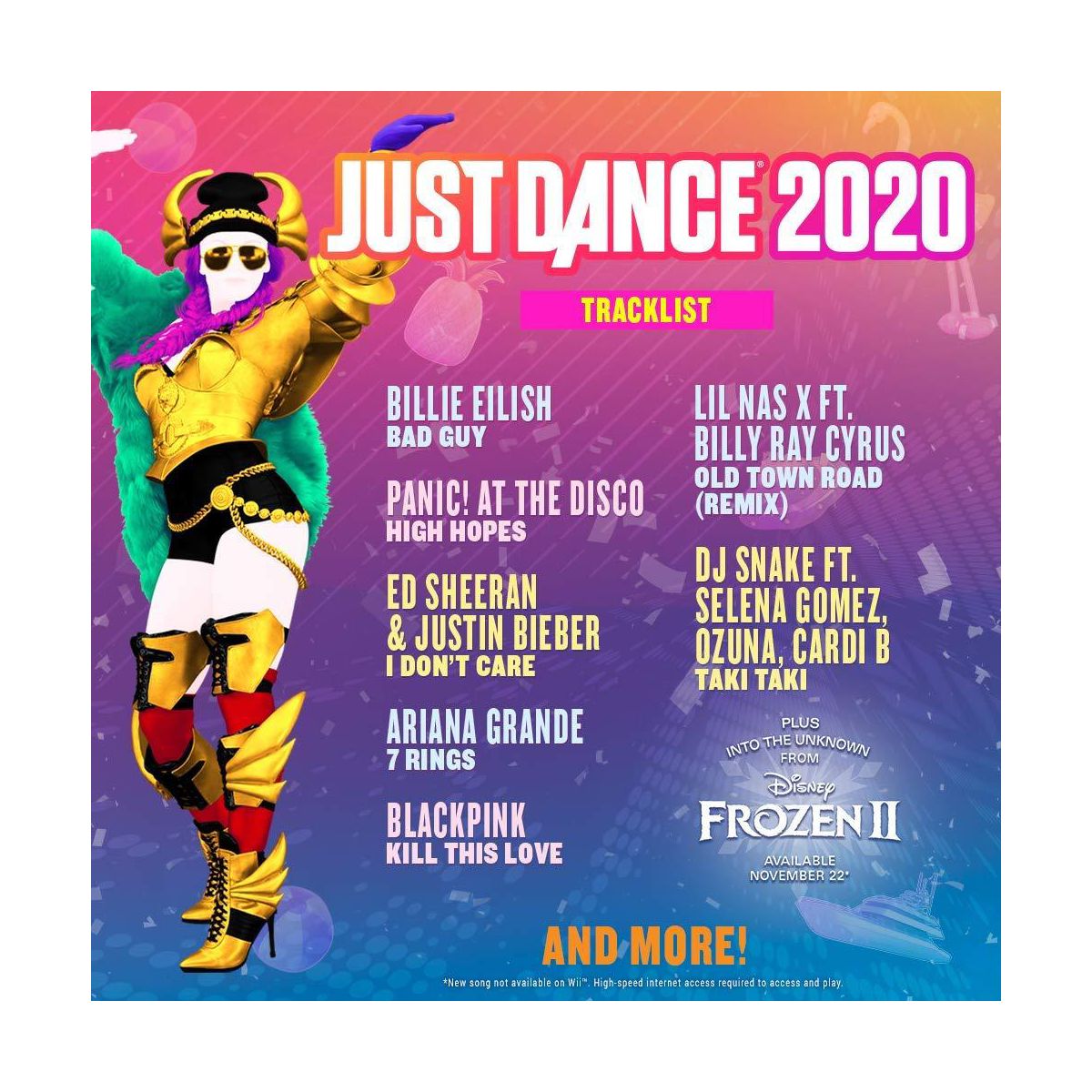 Just Dance 2020 from Ubisoft for the Sony PS4 is the ultimate dance game, with 40 hot tracks from chart-topping hits like "bad guy" by Billie Eilish, "Kill This Love" by BLACKPINK, "Old Town Road (Remix)" by Lil Nas X Ft. Billy Ray Cyrus, "7 rings" by Ariana Grande, and the new song "Into the Unknown" from Disney’s Frozen 2.With Just Dance Unlimited, dance to over 500 of your favorite songs! Every copy of the game comes with 1-month free access!Personalize your experience with custom playlists and curated recommendations based on your dance preferences.The acclaimed Kids mode is back! Eight new kid-friendly choreographies and additional curated songs to help the youngest players learn healthy movement.Enjoy dancing with your friends in co-op mode. Play together to get the highest scores possible!Immerse yourself in the Just Dance universe and go through 10 years of fun and endless creativity with a digital collection of iconic stickers reflecting the last 10 years of Just Dance!Use your smartphone to track moves - no PlayStation Move required! Up to six players can join the fun.Keep the party going for hours with songs for the whole family to enjoy! Just Dance is bigger than ever with 40 of the hottest chart-topping tracks. Let the dancing begin!Features:40 Hot New Tracks: Keep the party going with the latest hits like “I Don't Care” by Ed Sheeran & Justin Bieber, and the new song “Into the Unknown” from Disney's Frozen 2.Free Just Dance Unlimited: Dance to 500+ of your favorite songs! A free one-month trial is included with every purchase.Choose Your Favorite Songs: Create your own playlists to customize your Just Dance parties.Kids Mode: Enjoy eight new kid-friendly songs, offering a fun experience for our youngest players.