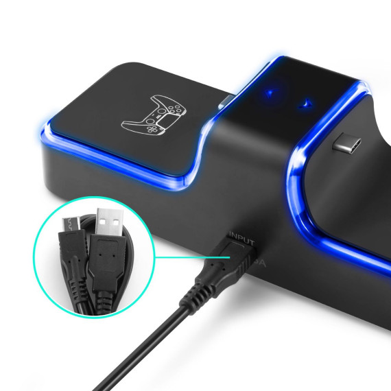 Keep your controllers ready for action with the Controller Charging Dock compatible with PS5. This controller dual charger is designed to power up two controllers at once, delivering a full charge in just 4 hours. Say goodbye to downtime and keep your gameplay seamless with this must-have charging station. Powered via USB-C, the controller dock includes a USB charging cable for flexible power options—from disc and digital version consoles to AC adapters, USB hubs, and computers. It also features an additional USB-A output port to charge other devices or accessories alongside your controllers. The smart LED indicator keeps you in the know: red means your controller is still charging, while blue indicates a full charge. A soft ambient blue light adds a futuristic glow to your gaming area, enhancing your immersive experience. Crafted with a compact, precision-fit design, this controller charging stand allows easy placement of your controllers into the charging dock station. Keep your setup organized and your controllers always ready for battle—all while elevating your gaming vibe with style and function.