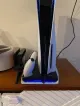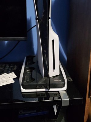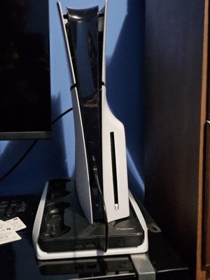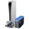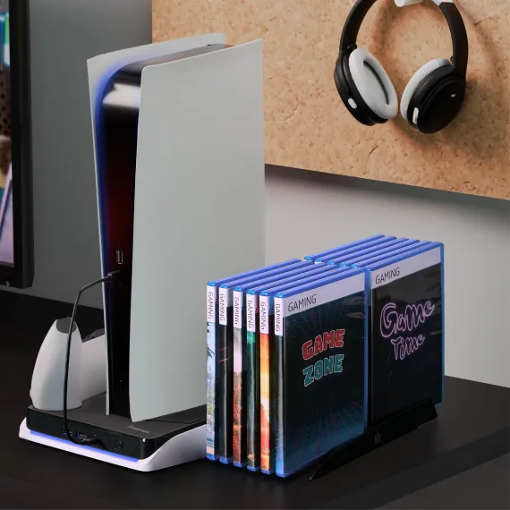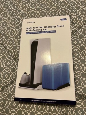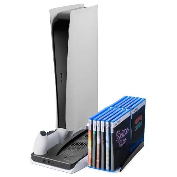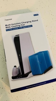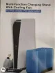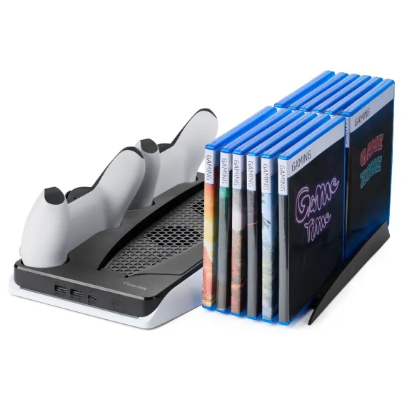 Compatible with the PS5 Digital and Ultra HD Edition. Maximize your gaming experience with this all-in-one multifunctional cooling station. This comprehensive controller charging station combines a console vertical stand, cooling fan, video game storage, and USB hubs, keeping all your gaming essentials in one convenient place. Charge your controllers efficiently with the dual high-speed controller charger. This all-in-one docking charger features two high-speed charging docks, allowing you to charge up to 2 controllers simultaneously. In just 3 hours, your controllers will be fully charged and ready for action. The smart LED indicator visually displays the charging status, emitting a red glow while charging and turning green when fully charged. Experience an effortless and silent cooling system with this sturdy metal-based cooling station. Equipped with 2 fans, it effectively dissipates heat and prevents potential overheating issues. Customize the cooler to operate in mute, low noise, or high-speed mode to suit your gaming environment. This stand features a retractable video game storage holder slot that can accommodate up to 12 game discs. Say goodbye to searching for your favorite games and enjoy easy access and efficient organization. With 3 additional USB ports, allowing you effortlessly connect your accessories, such as a mouse, keyboard, headset, and other USB devices. This package includes a black multifunctional stand compatible with Playstation 5 Digital and Ultra HD Edition and a fixed USB charging cable for connecting to your console. It comes complete with dual controller charging docks, 2 silent cooling fans, a console vertical stand, 12 video game storage slots, and 3 additional USB ports. This cooling station stand is the perfect way to store and display your favorite console and accessories in your gaming room. This multifunctional station is a must-have for gamers. It also makes a great gift for gamers.