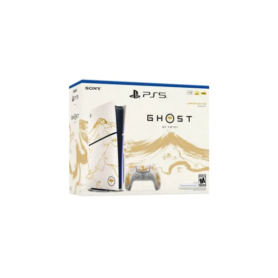 PlayStation®5 Console – Ghost of Yōtei™ Gold Limited Edition Bundle includes: Limited Edition PlayStation®5 console, Limited Edition DualSense® wireless controller, Ghost of Yōtei™ full game voucher (includes pre-order digital content), 1TB SSD, Disc Drive (attached to the console), 2 Horizontal Stand Feet, HDMI® cable, AC power cord, USB cable, printed materials, and ASTRO’S PLAYROOM (Pre-installed game).