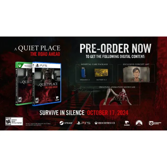 A Quiet Place: The Road Ahead is a single-player horror adventure game inspired by the critically acclaimed blockbuster movie franchise that highlights a unique survivor story after an invasion of deadly creatures. In this exclusive spin-off, experience the journey of a young woman who must endure a treacherous apocalypse in the midst of interpersonal family conflicts, all while coming to terms with her own inner fears.