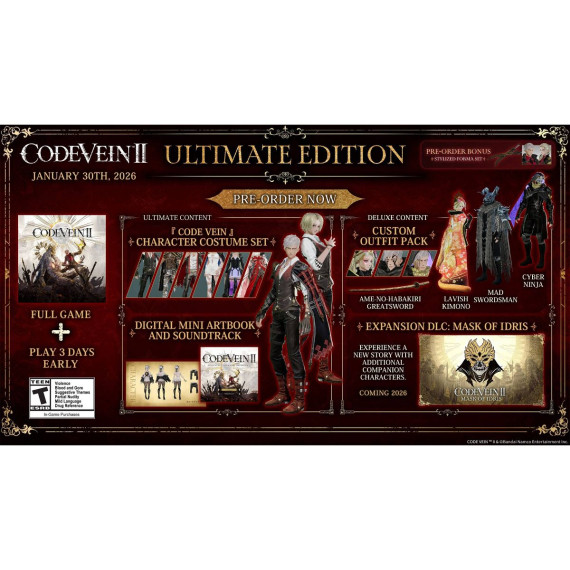 Experience Code Vein II’s unique gameplay mechanic, where the player drains and acquires blood from enemies to unleash a variety of skills. With the series’ new build system, you can freely customize weapons and skills to suit your own battle styles.