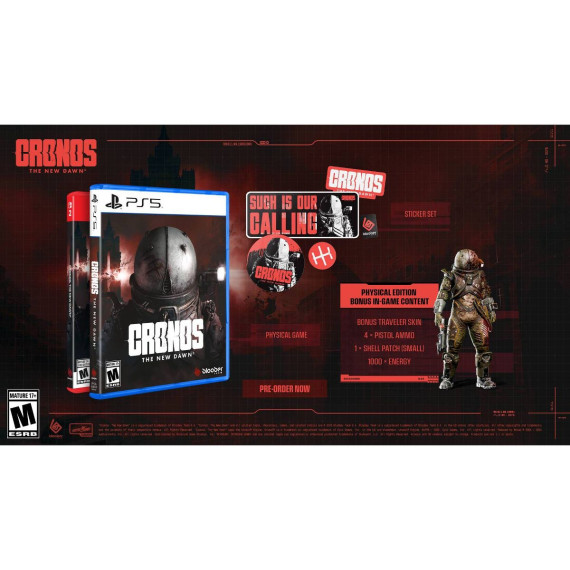 This physical edition of Cronos: The New Dawn comes with exclusive in-game content and collectibles to kickstart your journey. Uncover a unique Traveler skin for your character, gain access to a cache of valuable supplies, and decorate your gear with a set of collectible stickers inspired by the haunting world of Cronos.