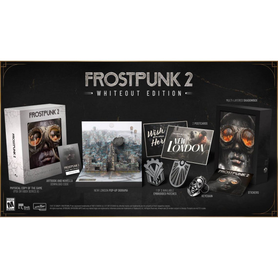 This box includes the Icebreaker Edition of the game (featuring the New London pop-up diorama and a digital artbook & novella), as well as a Deluxe Edition upgrade code printed on high-quality card stock. The Frostpunk 2 Whiteout Edition is packed with additional content: a multi-layered shadowbox, free access to the first 3 DLCs, an exclusive in-game item, physical cards, a metal keychain, a faction patch, and a set of stickers.