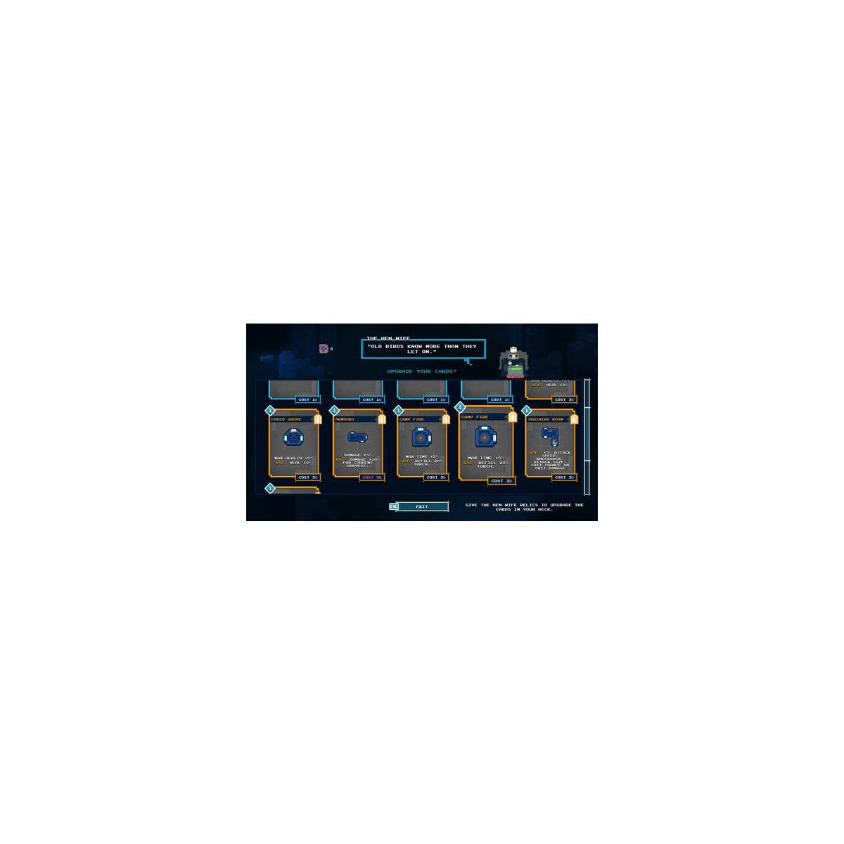 Earn favors from the Harvest Maiden, find Relics to trade with the Hen Wife and Wulver to upgrade and curate your deck, and hope you are strong enough to face The Warden when you can finally reach it.